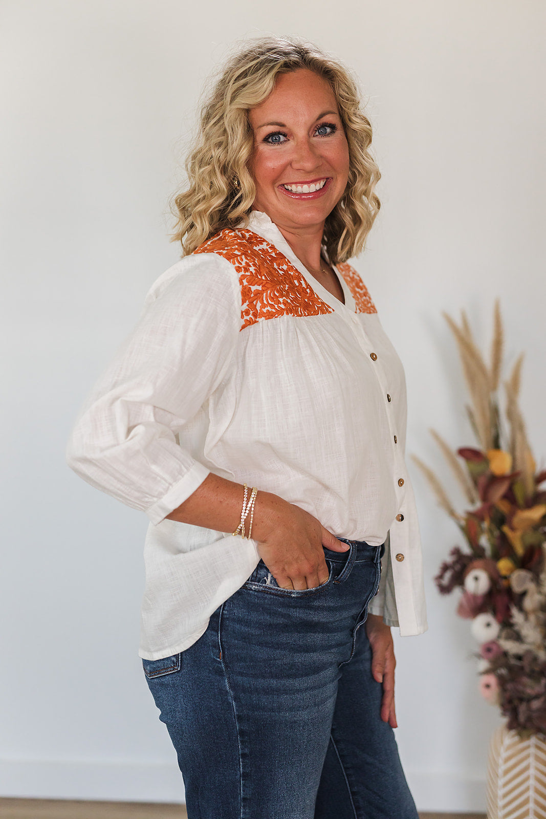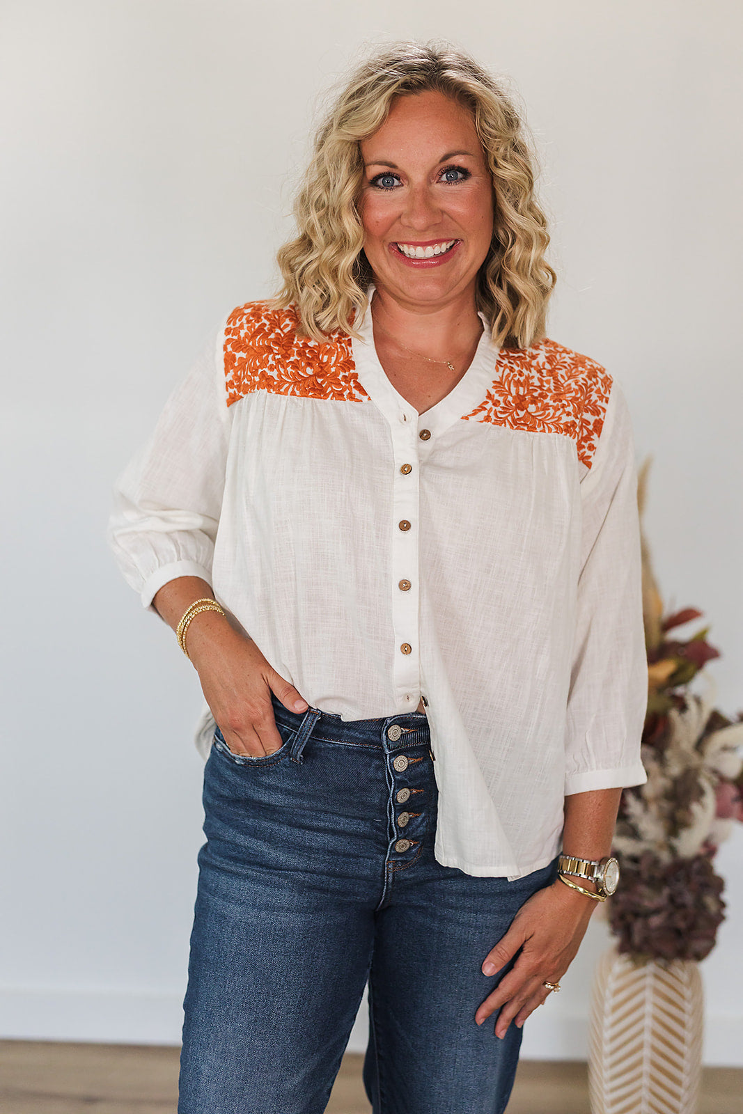 Want a top that is perfect for your next tailgate, but you can also wear year round? The Jane top is perfect for that! This top is a lightweight fabric with embroidery on the front and back and wooden buttons down the front. Pair with jeans or white bottoms for any occasion!