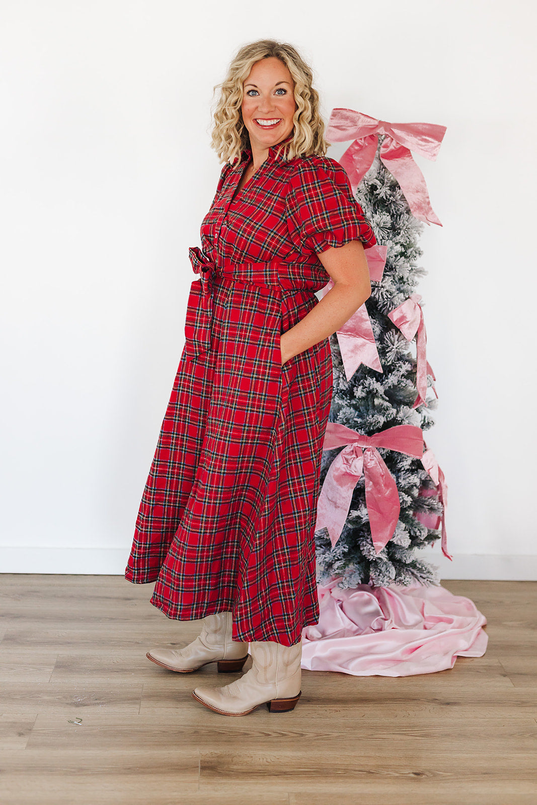 Plaid puff sleeve midi dress featuring self-tie waist belt and button closure at front. Side pockets. Lined. Woven. Non-sheer. Medium weight.