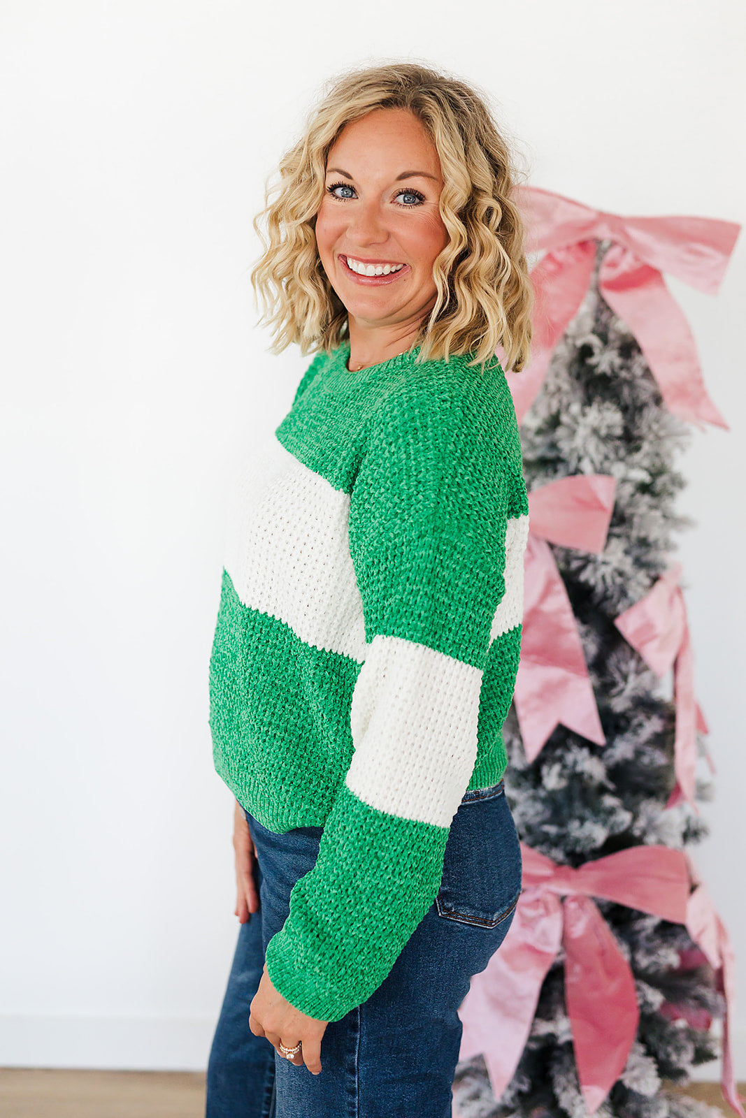 Product Detail: This color blocked sweater showcases a soft chenille waffle knit texture, a classic crew neckline, and long sleeves, designed with bold horizontal stripes and a relaxed, slightly cropped silhouette for a cozy yet playful look.