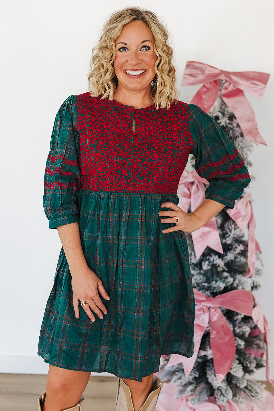 Ideal for holiday gatherings, it’s a cozy, classic look with a touch of seasonal magic. Charm meets tradition in this green plaid dress with delicate red embroidery, blending festive flair with timeless elegance.