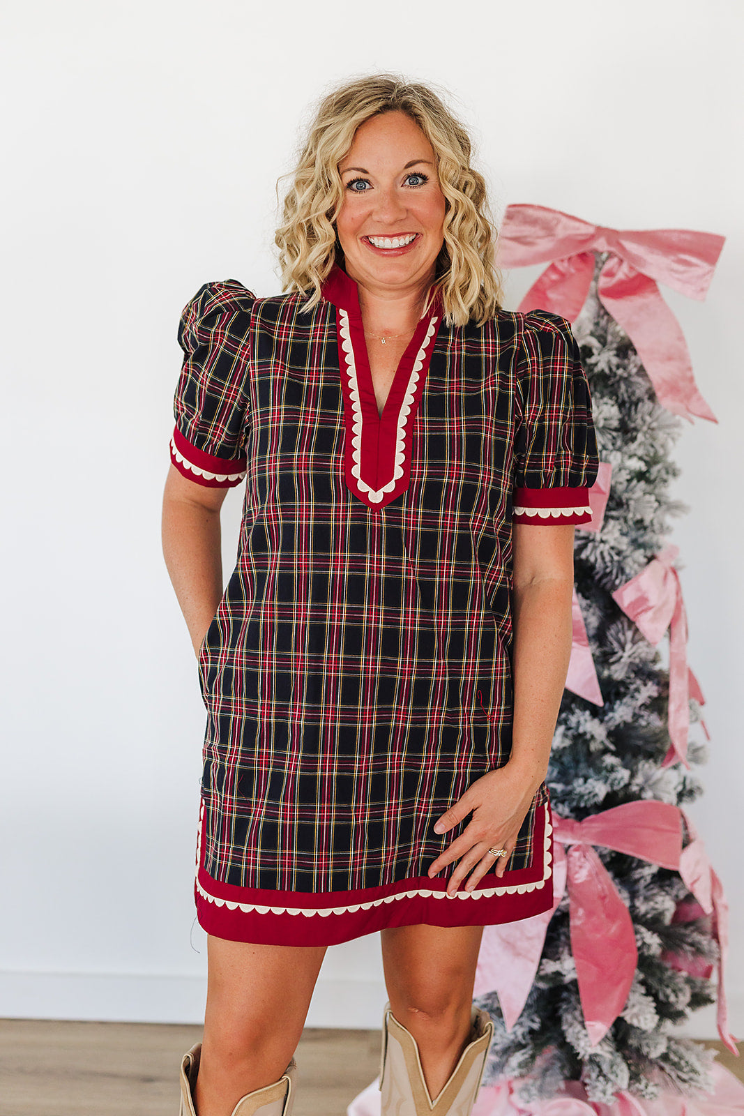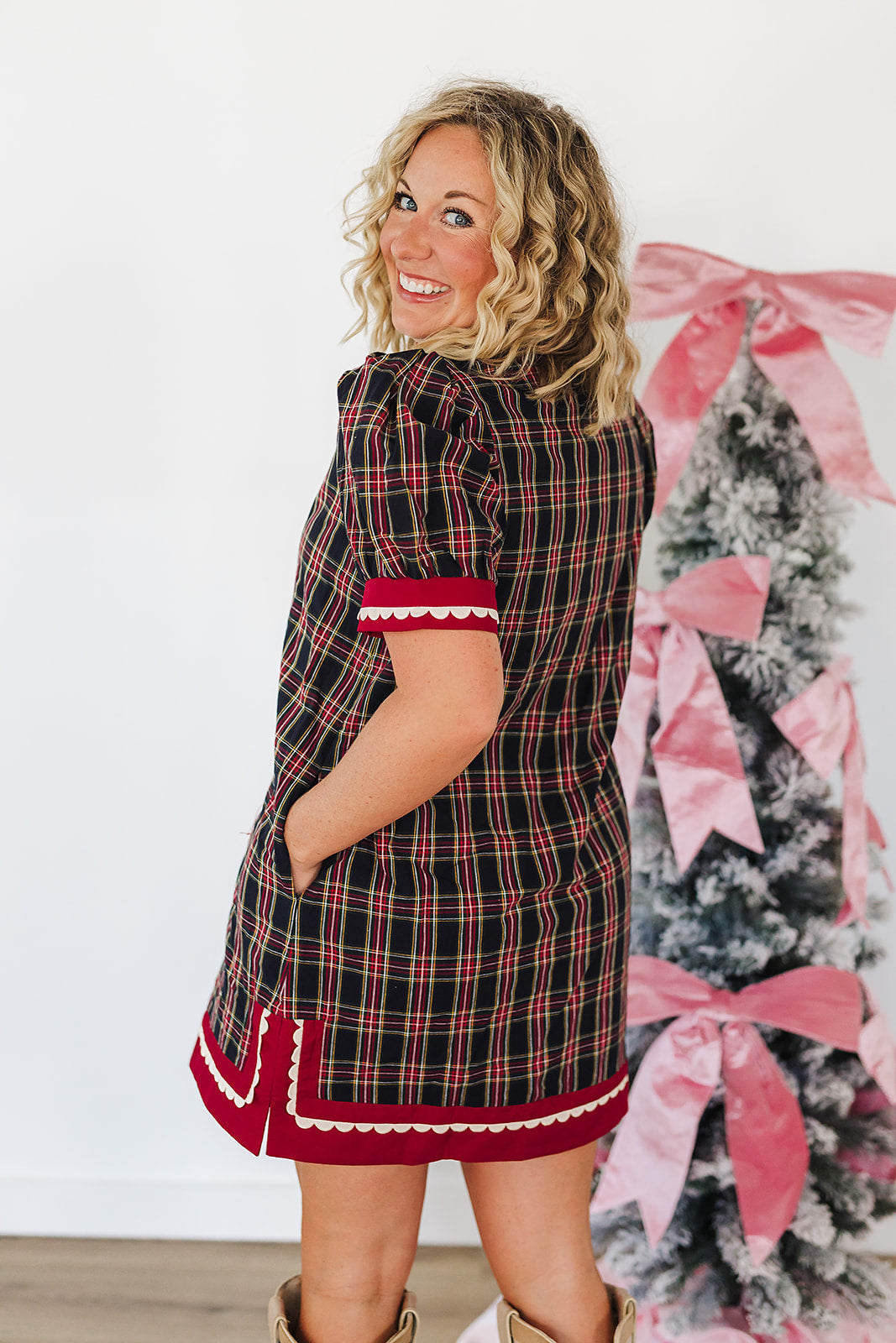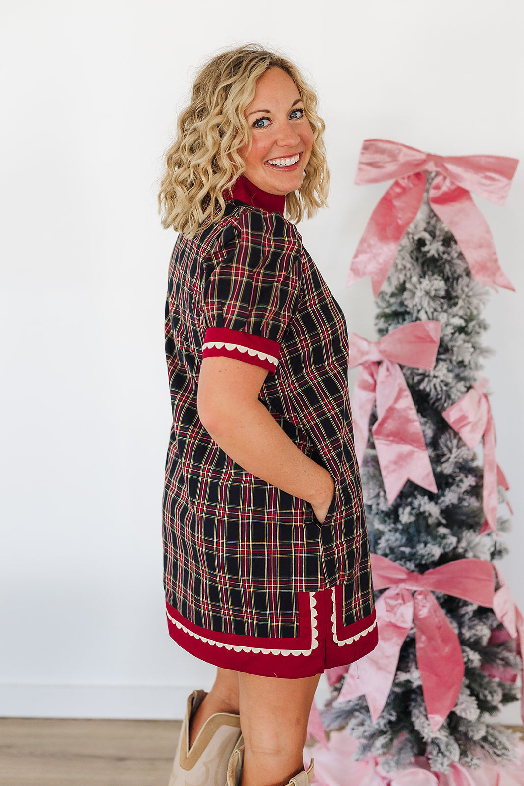 Plaid pattern short puff sleeve mini dress featuring trim inset contrast aceent caftan-inspired band and slit hem. Side pockets. Lined. Woven. Non-sheer. Lightweight.