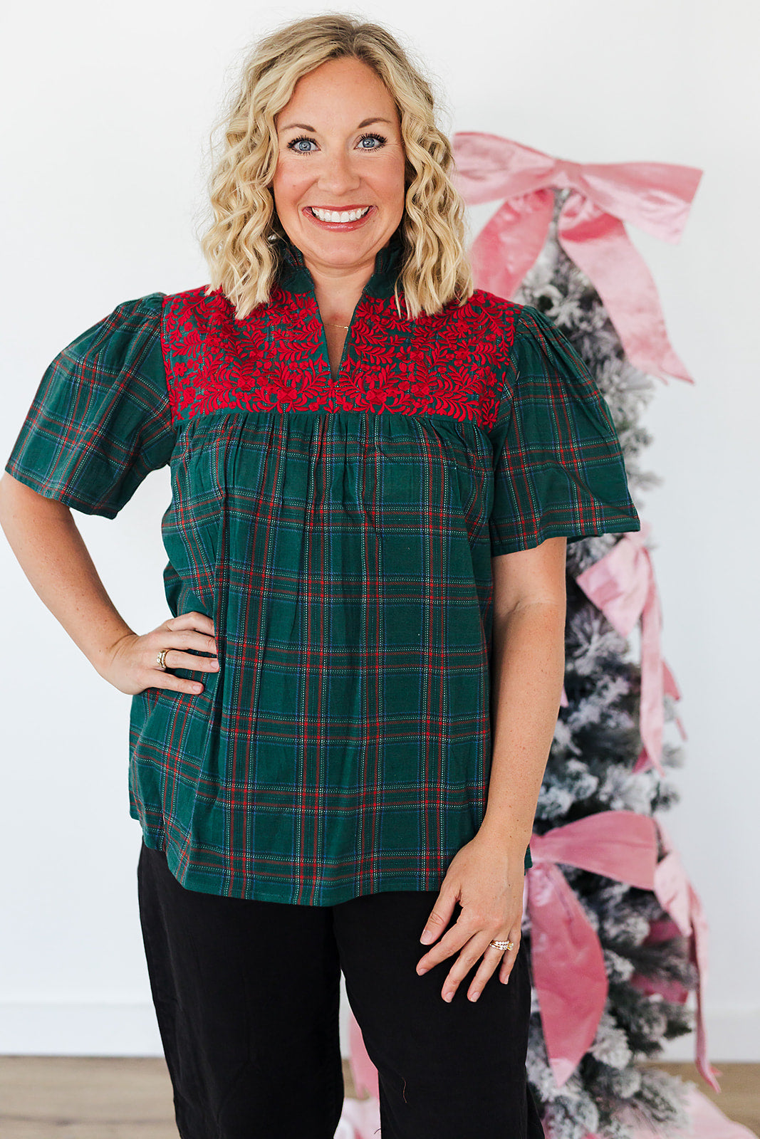 Ideal for holiday gatherings, it’s a cozy, classic look with a touch of seasonal magic. Charm meets tradition in this green plaid top with delicate red embroidery, blending festive flair with timeless elegance.