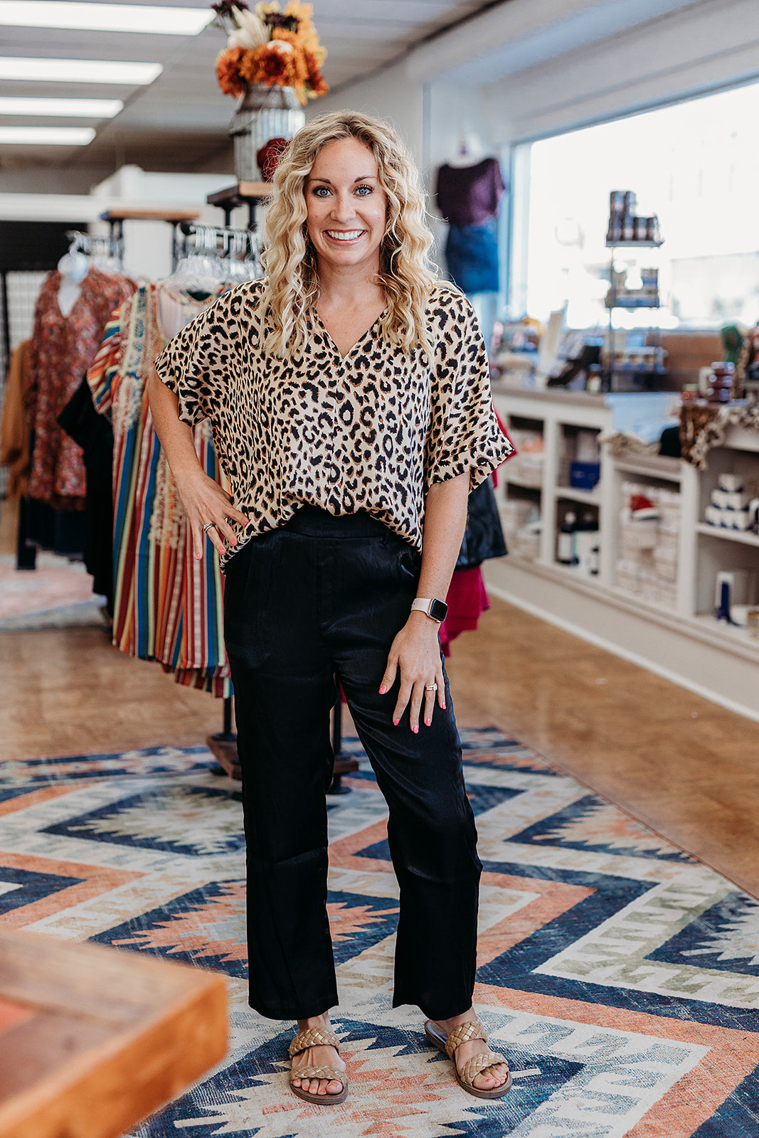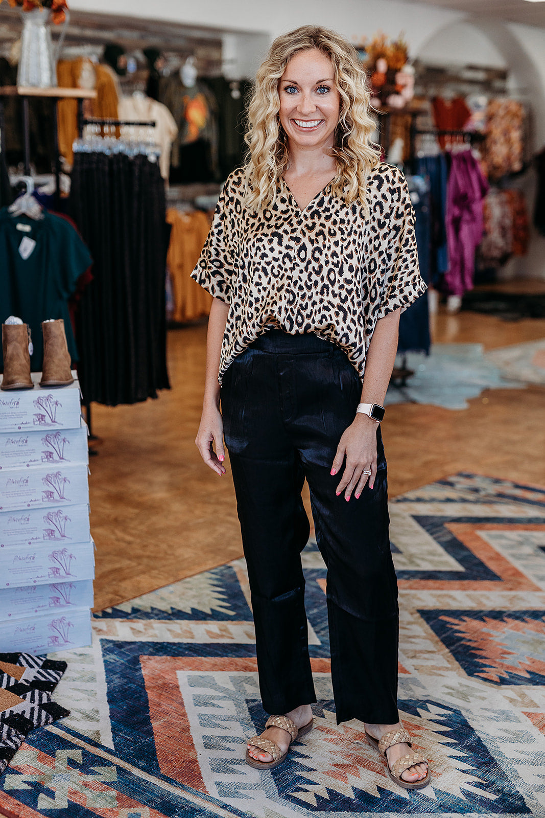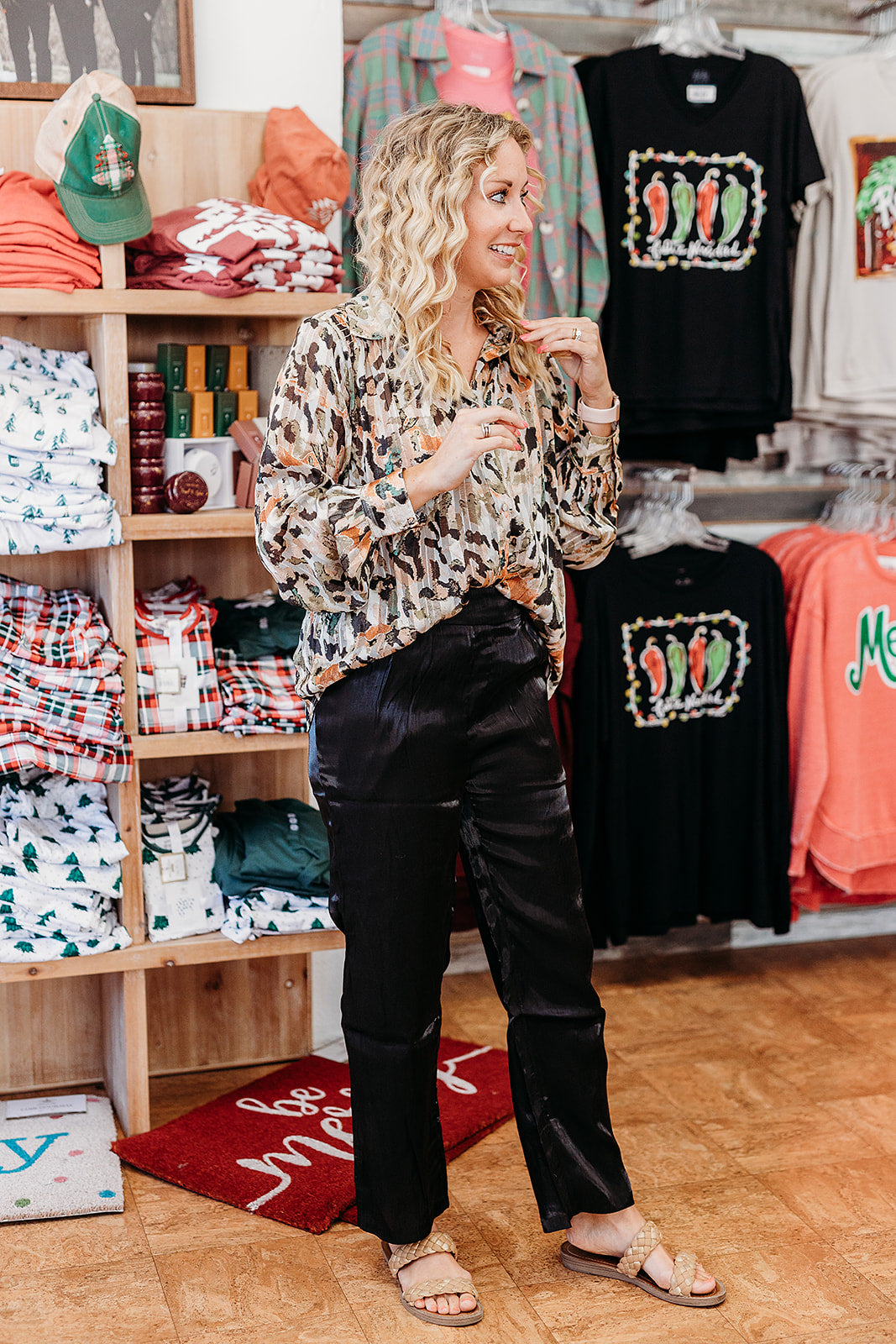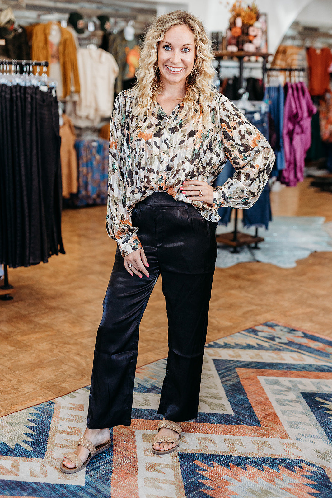 Shiny solid straight leg pants with front belt loop, tuck details, back stretch band waistline, side pockets.