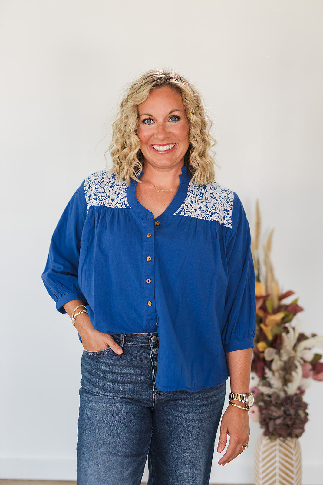Want a top that is perfect for your next tailgate, but you can also wear year round? The Jane top is perfect for that! This top is a lightweight fabric with embroidery on the front and back and wooden buttons down the front. Pair with jeans or white bottoms for any occasion!