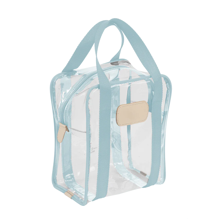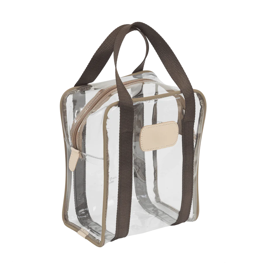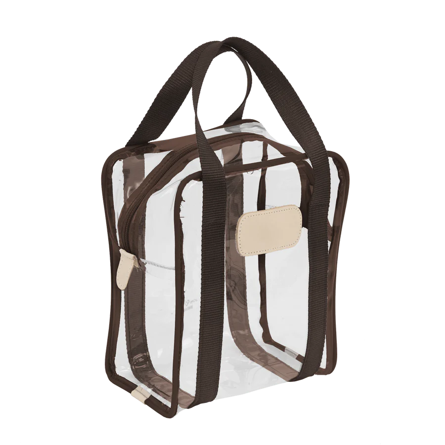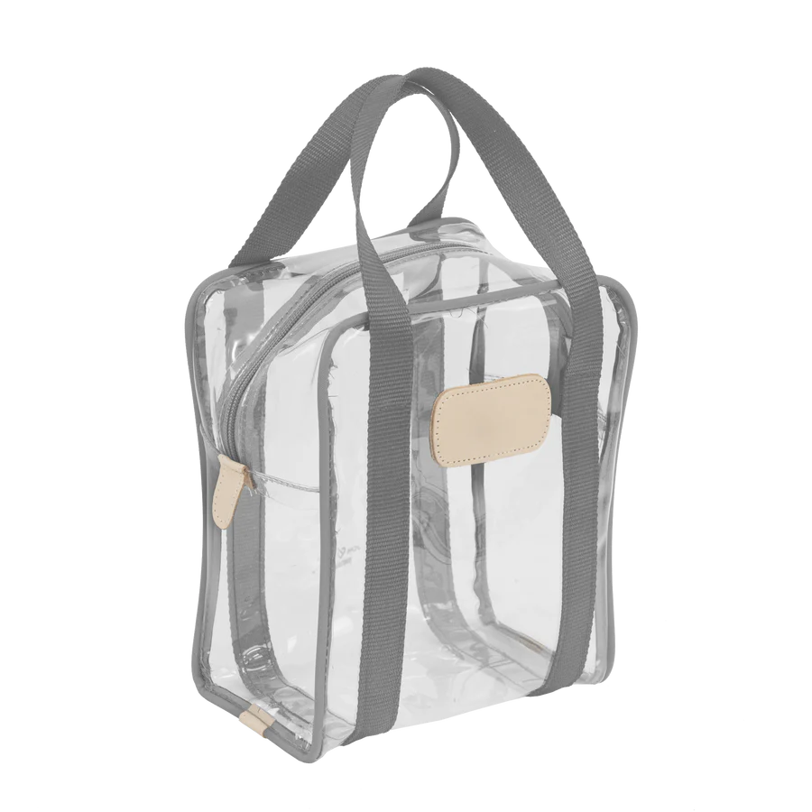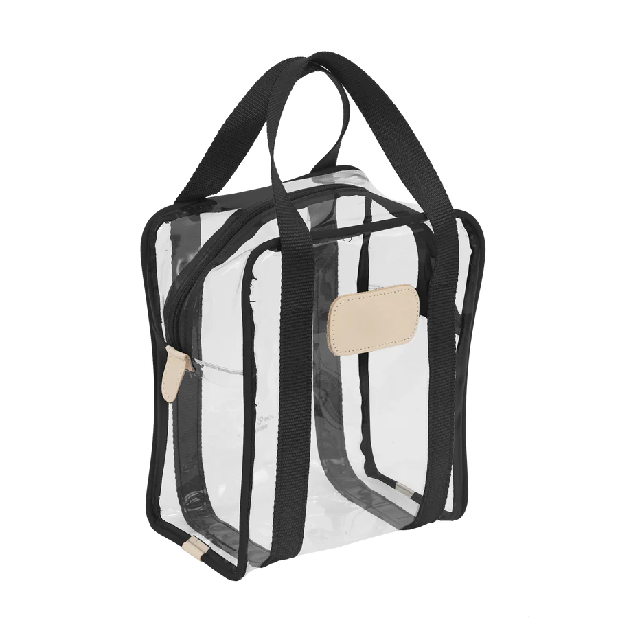 Clear Plastic material with Coated canvas Trim and a Natural Leather Patch