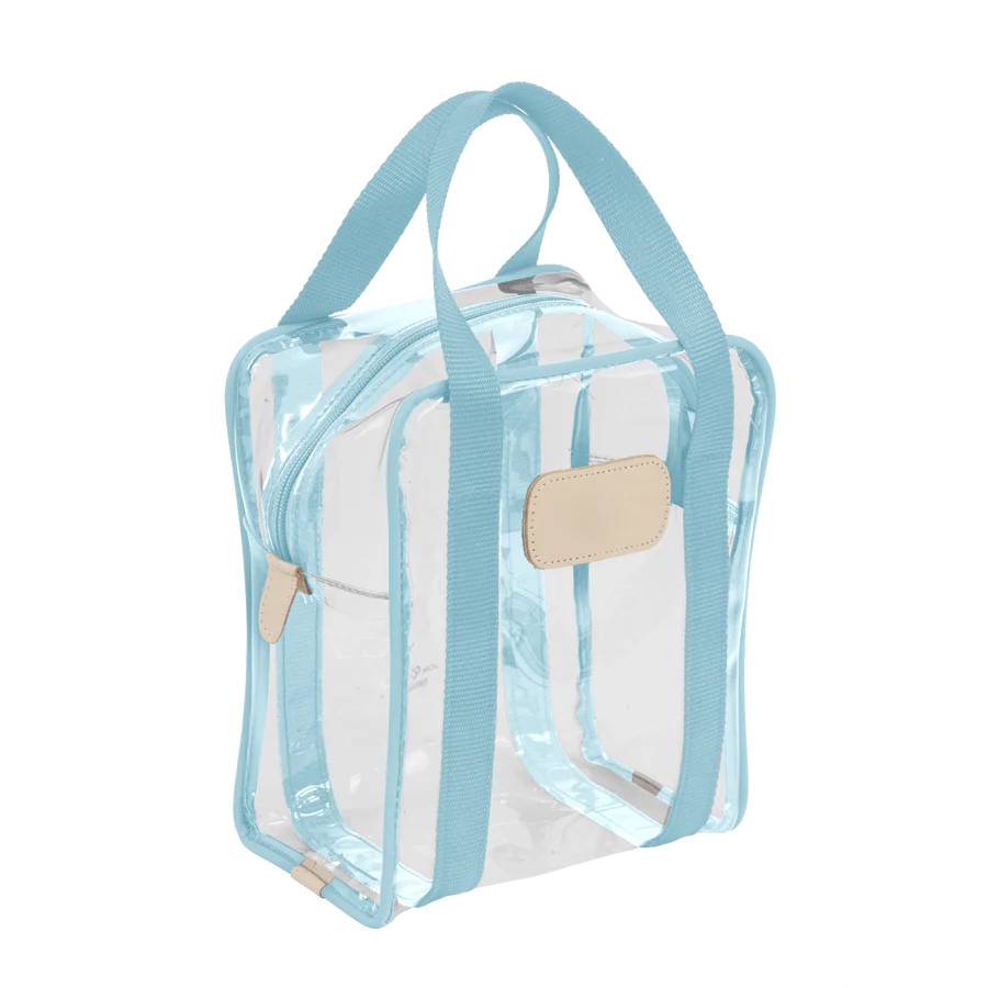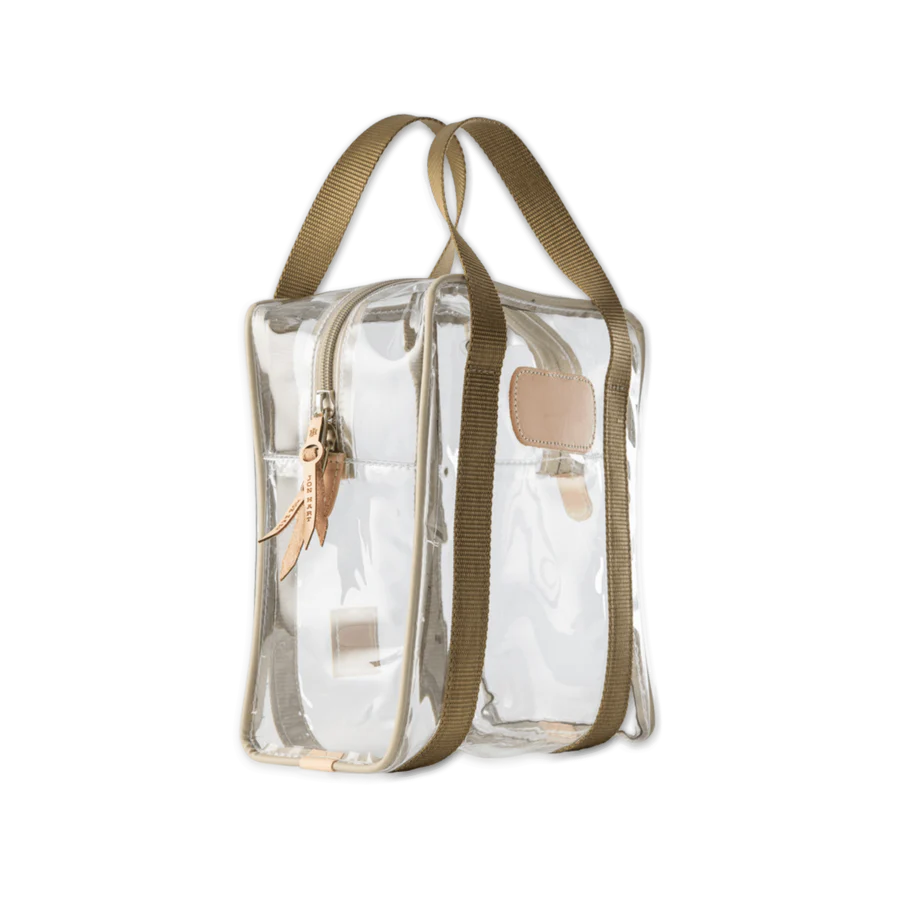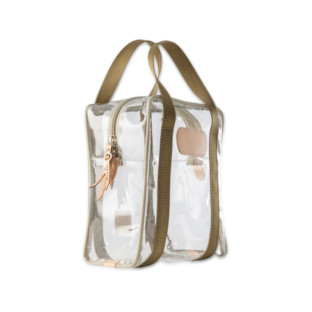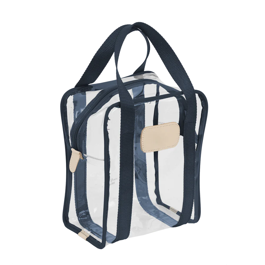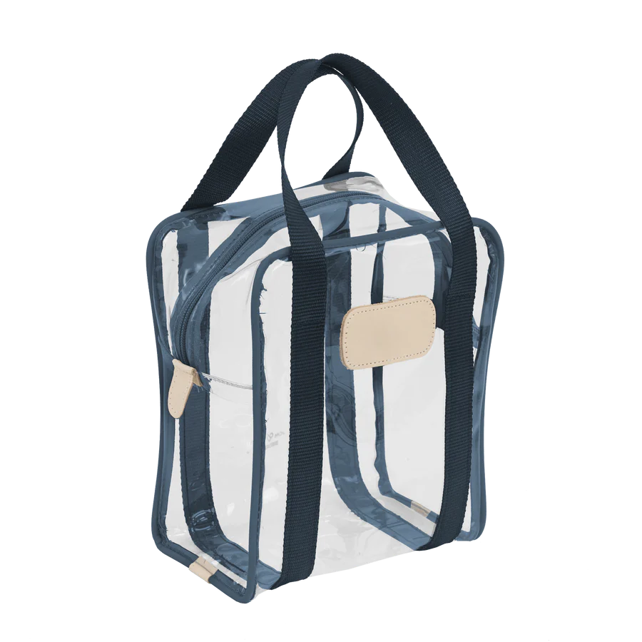 Clear Plastic material with Coated canvas Trim and a Natural Leather Patch