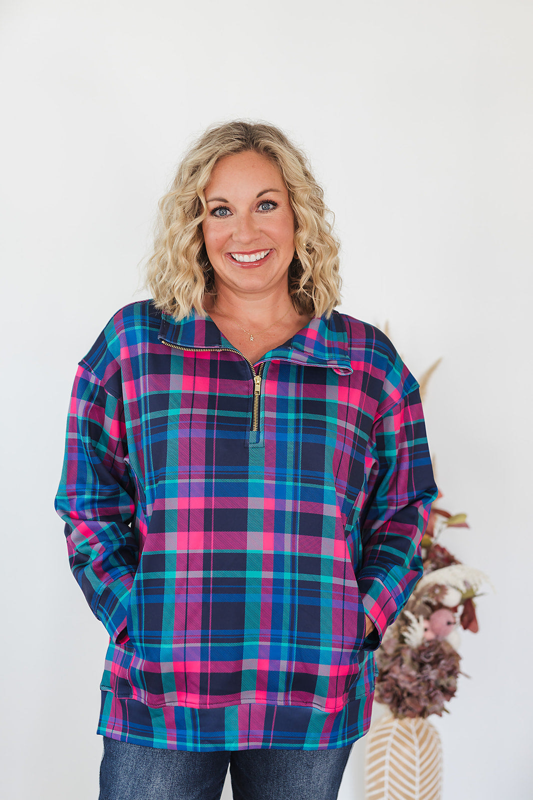 Wrap yourself in elegant comfort with our Everyday Pullover, Plaid Pop. This stylish pullover showcases a multi-color plaid pattern, highlighted by a gold quarter zip. Designed for all-day wearability, it's your new go-to for casual chic. Secure yours now through preorder and be the first to flaunt this charming addition to your collection.