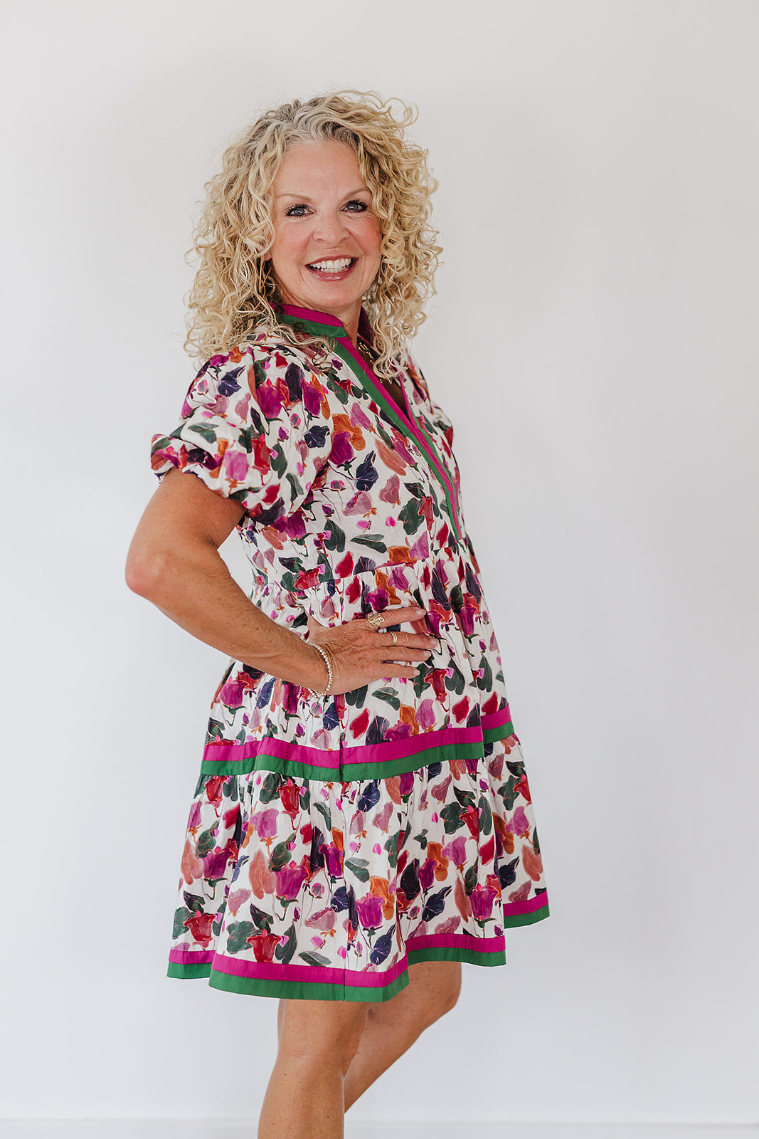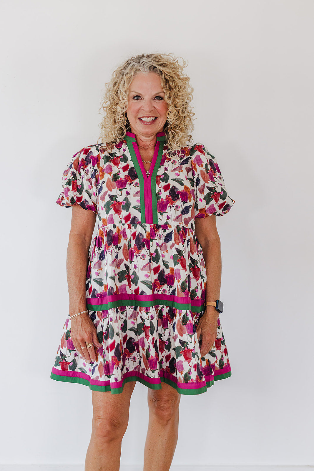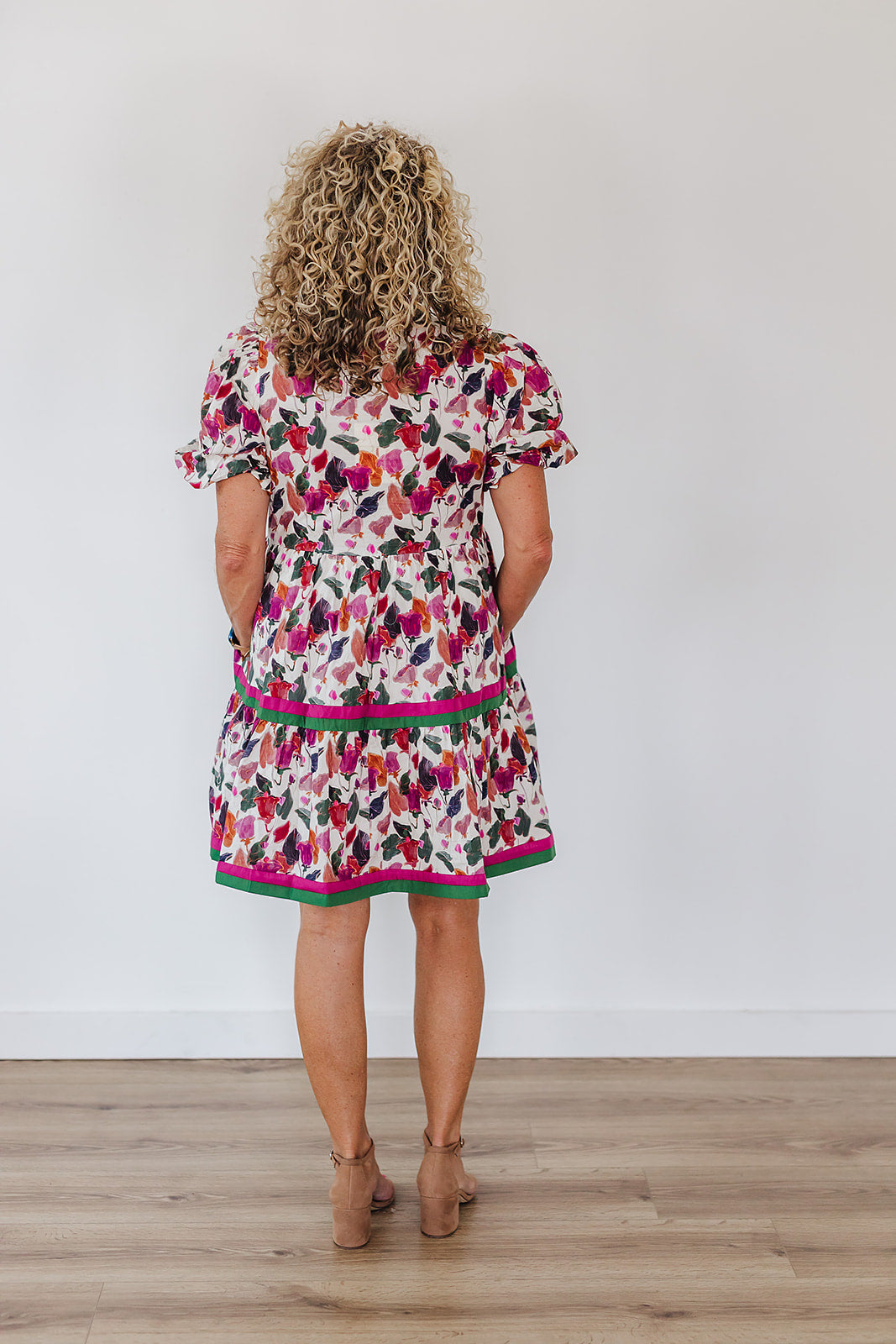 That Autumn Feeling Dress is a multicolor floral print short bubble sleeve pullover tiered mini dress featuring multicolor band accent. Pockets at sides, lined, woven, non-sheer and lightweight.