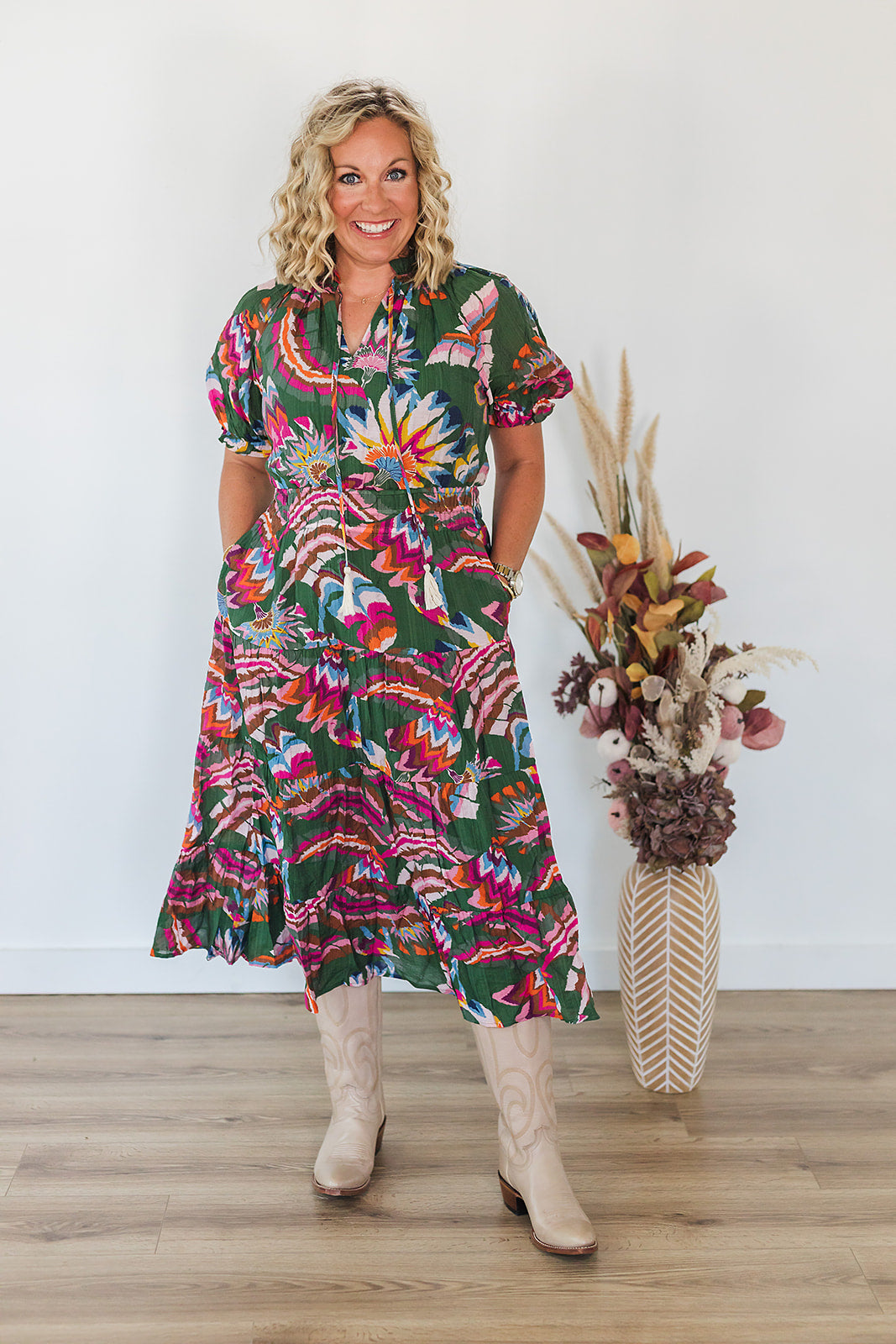Tassel Tie Puff Sleeve Print Maxi Dress
