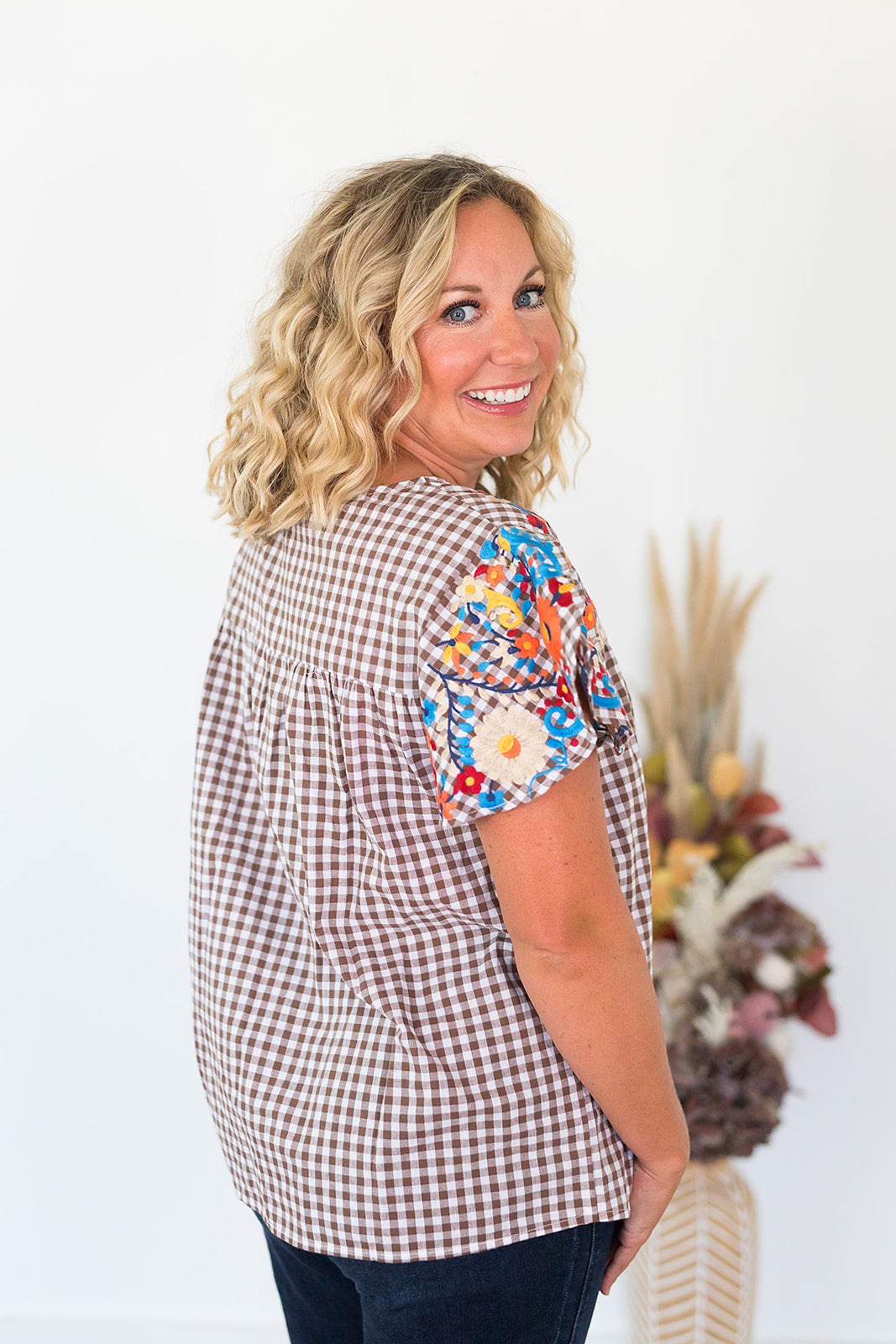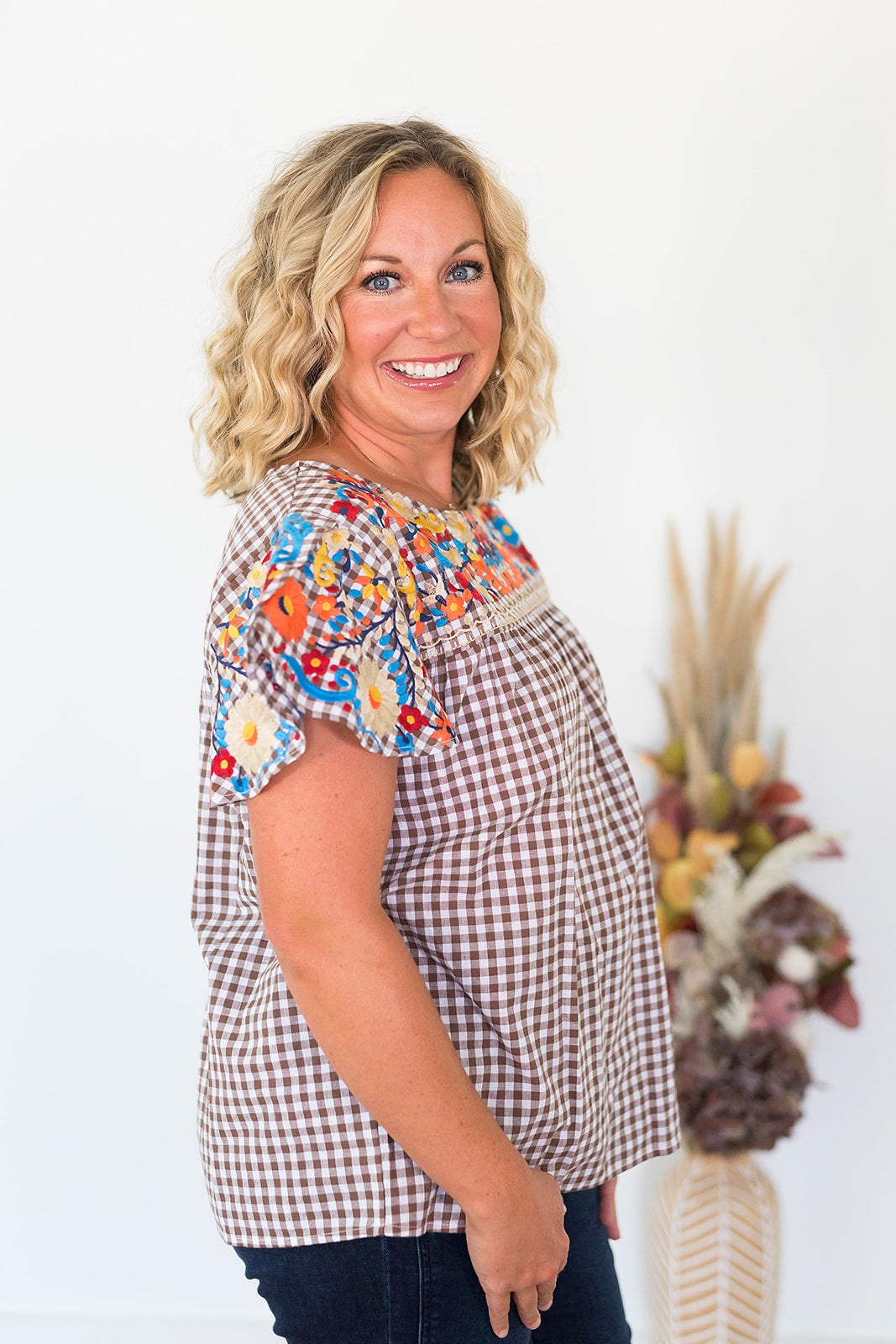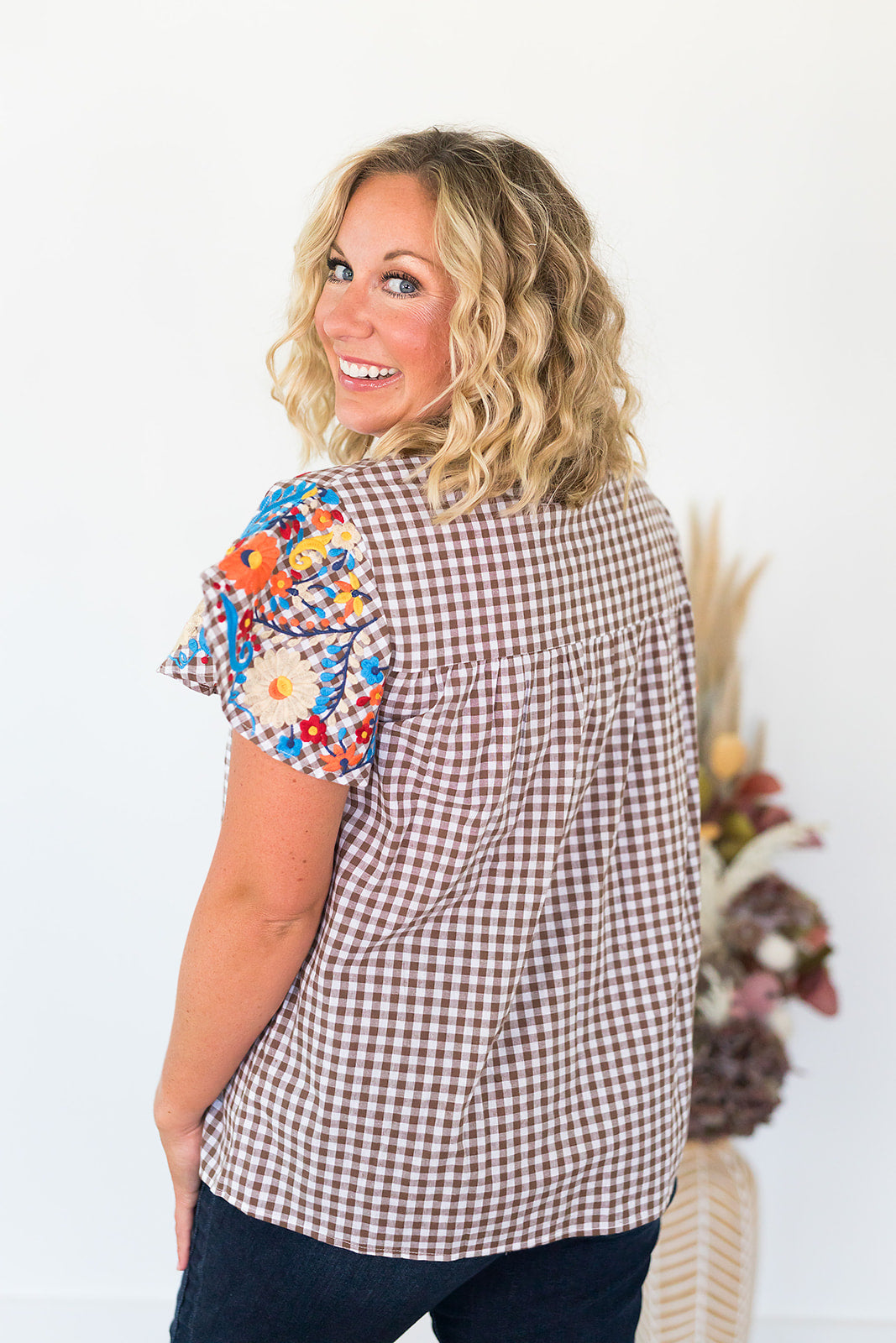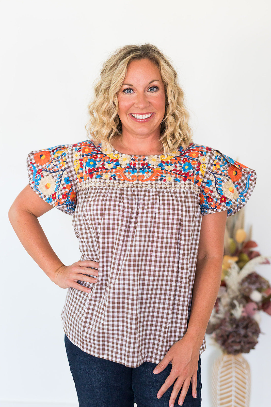 This is going to be your new go-to Thanksgiving top! The Tatum Top is a brown and white gingham butterfly sleeve top with fall colored embroidery. Pair with your brown pants and you're ready for Thanksgiving dinner!