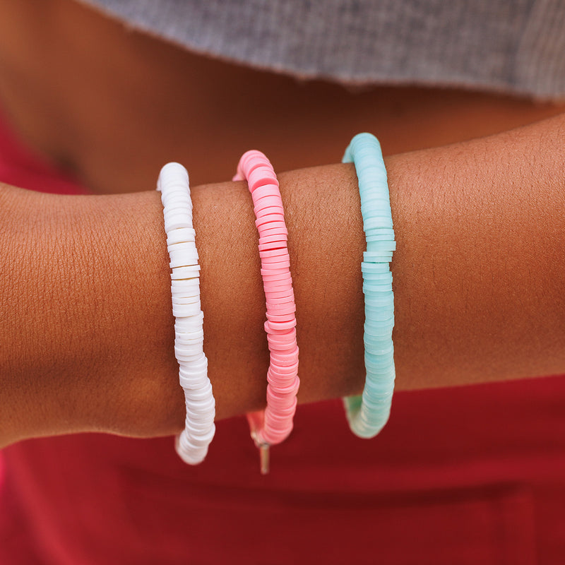Put together the prettiest stack ever with our Pastel Disc Stretch Bracelet. Available in three lovely shades—pastel blue, baby pink and fresh white—these easy-on-and-off styles feature vinyl disc beads, plus a trio of silver spacer beads for an extra accent.