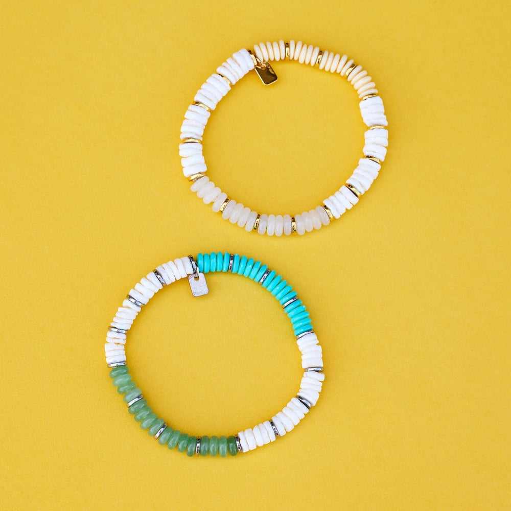 Introducing our beautiful Carmel Mixed Bead Stretch Bracelet, the ultimate accessory for your beach day look! Featuring a stunning combination of neutral colors this style includes disc beads, raw puka shell beads and sea glass beads that give it the perfect blend of boho-chic and beachy vibes.