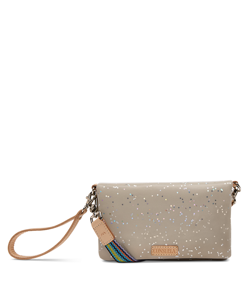 - Included detachable wristlet strap and adjustable woven crossbody strap