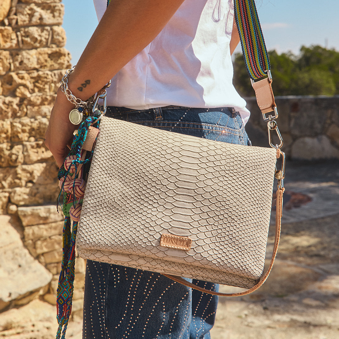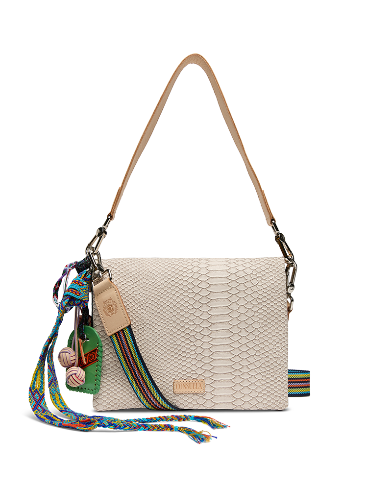 - Included detachable shoulder strap and adjustable woven crossbody strap