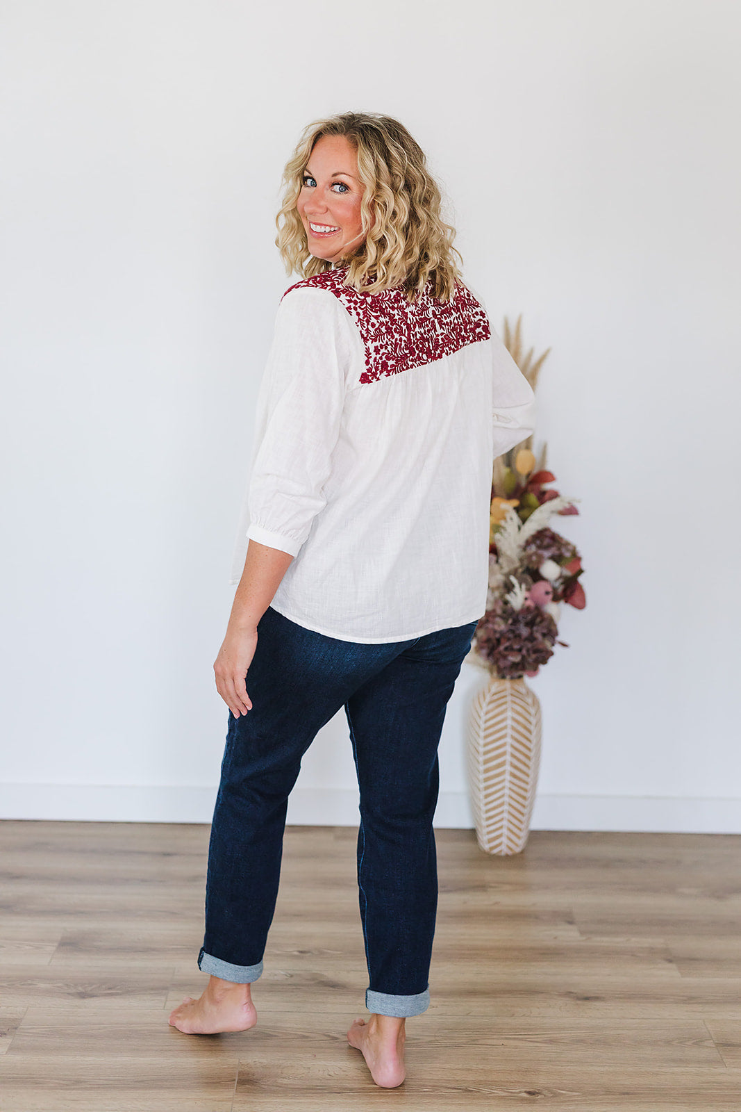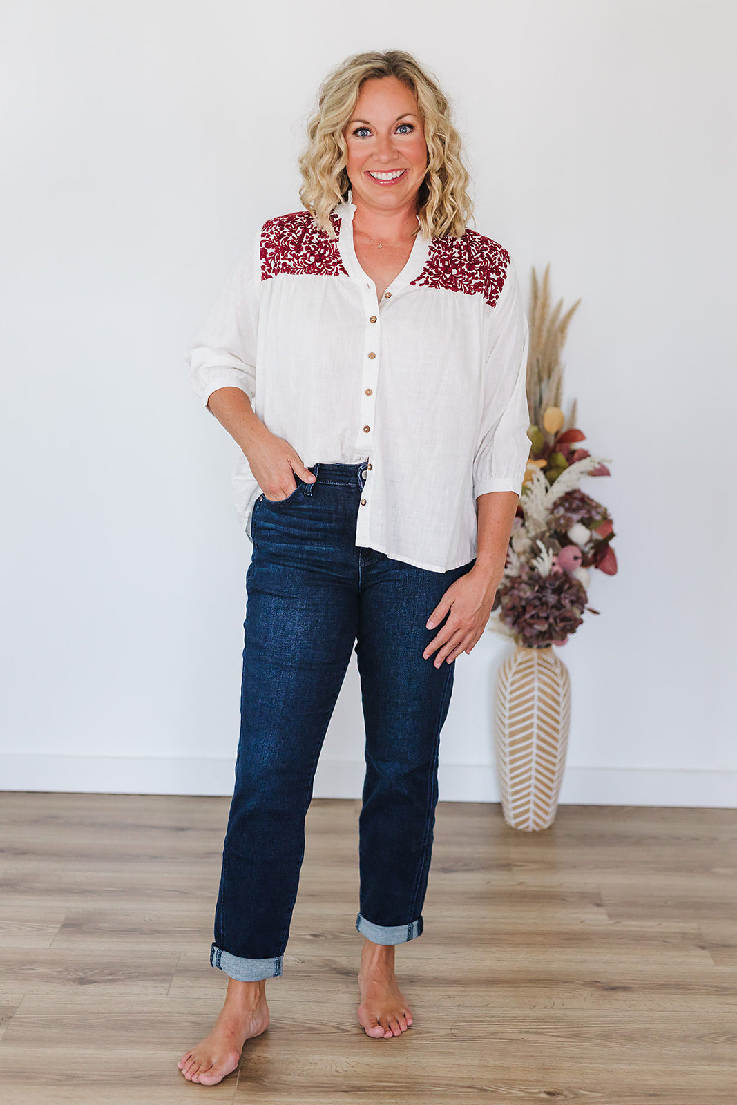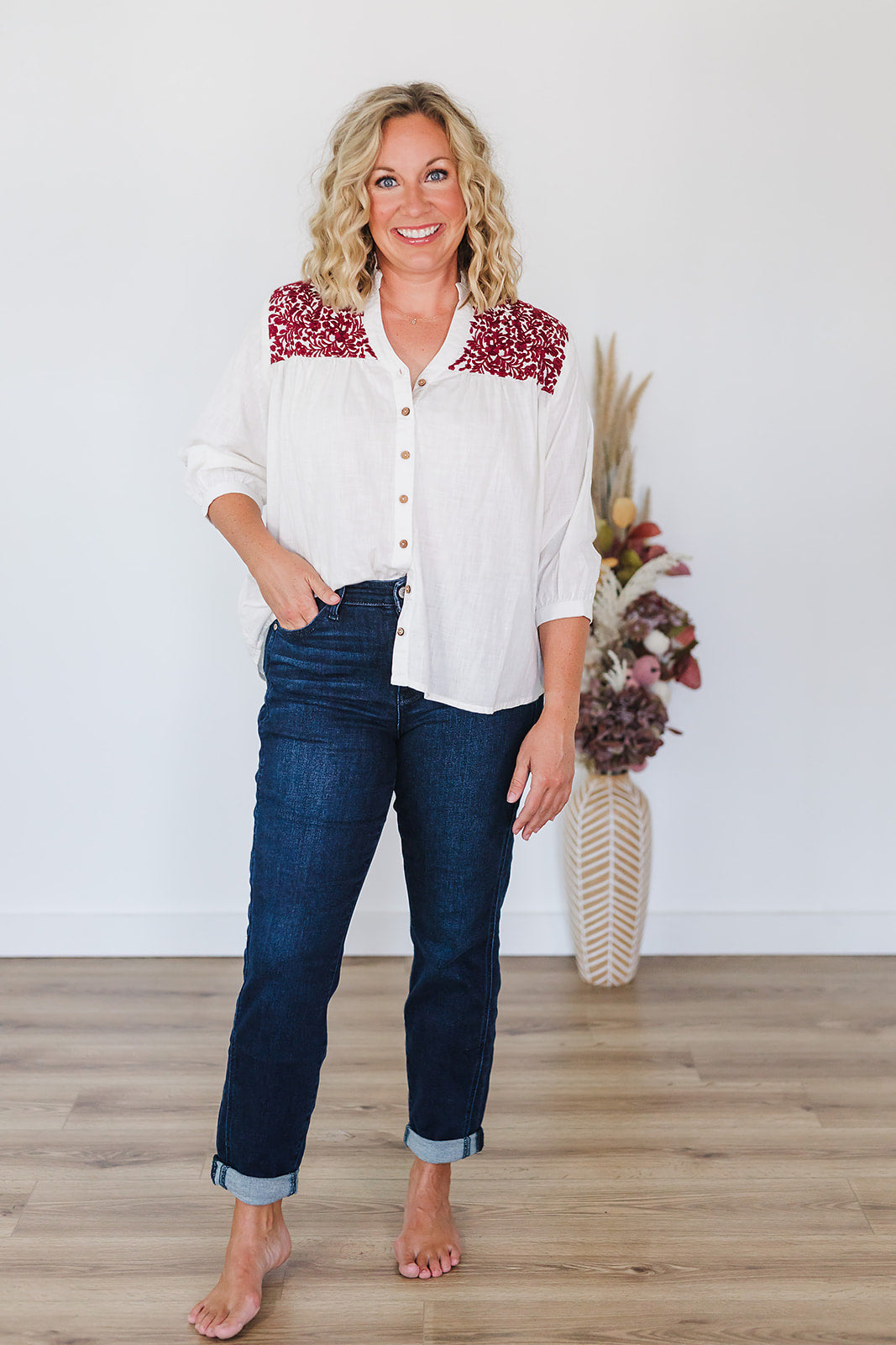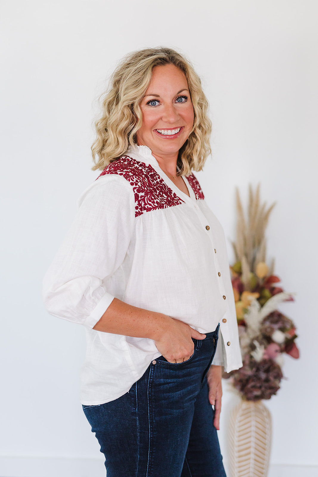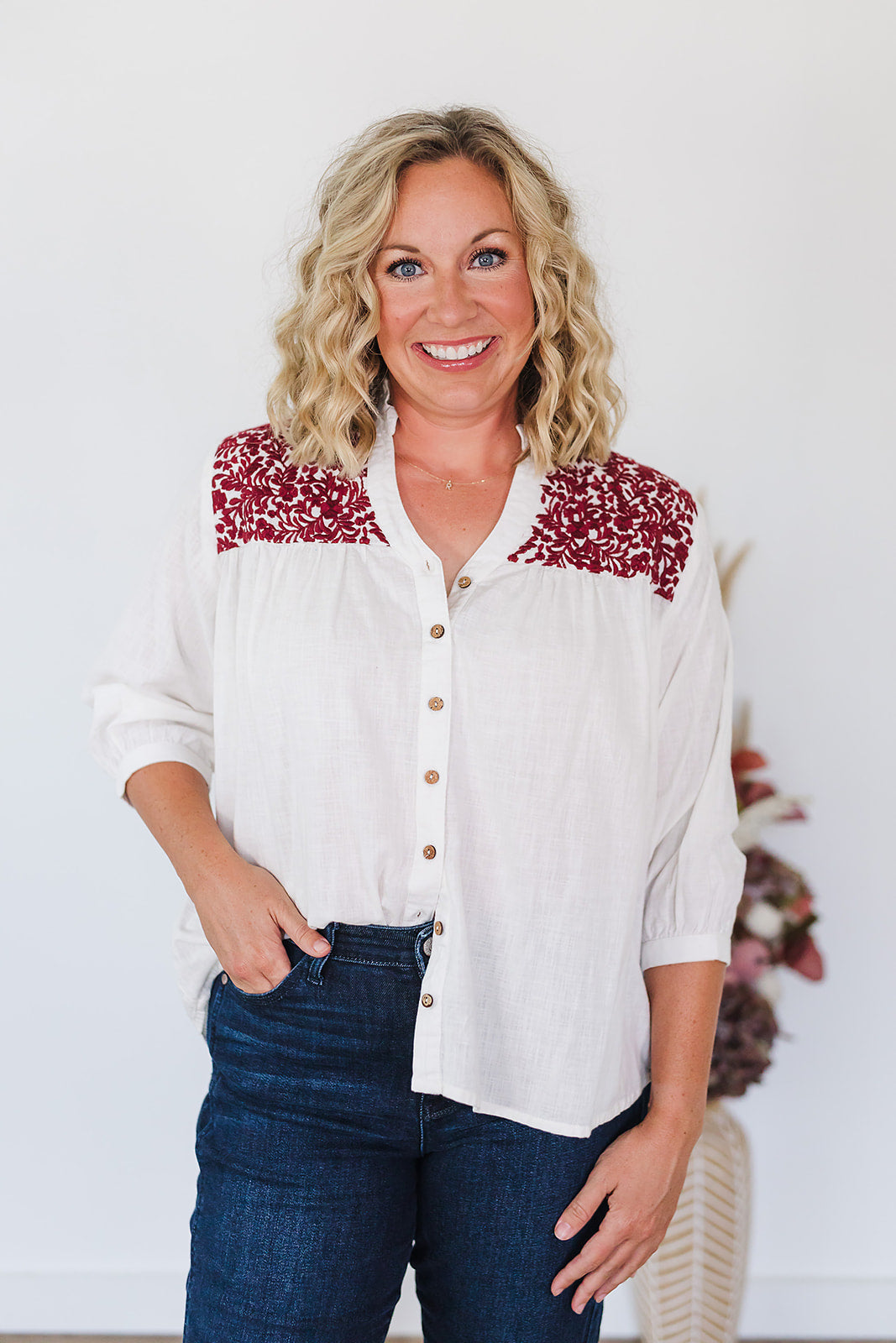 Want a top that is perfect for your next tailgate, but you can also wear year round? The Jane top is perfect for that! This top is a lightweight fabric with embroidery on the front and back and wooden buttons down the front. Pair with jeans or white bottoms for any occasion!