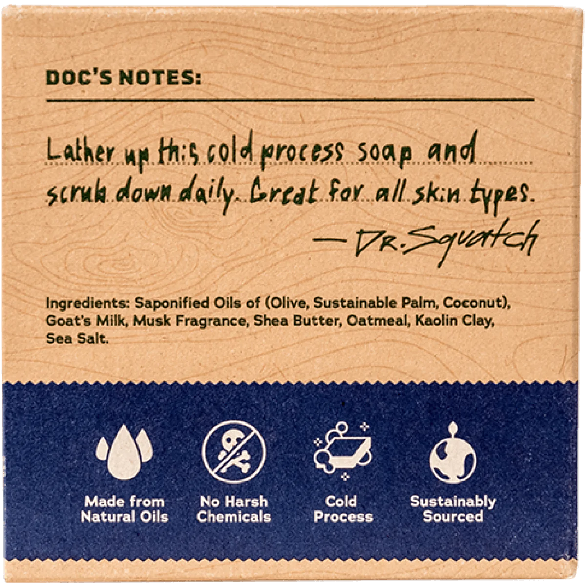 A Deep Sea Treasure for Dry Skin. Ahoy all ye Squatchbucklers! For this seafaring-yet-earthy bar of natural goodness we start with, yes, goat's milk: a natural ph-balancer with alpha-hydroxy acids that will help rejuvenate and moisturize your skin. Oatmeal makes waves in this hardworking soap with the perfect amount of natural exfoliation. This stuff is so great you might even call it the 'GOAT' from sea to sea, as in, the Greatest Of All Time.