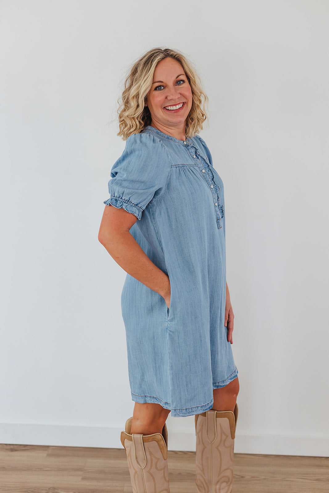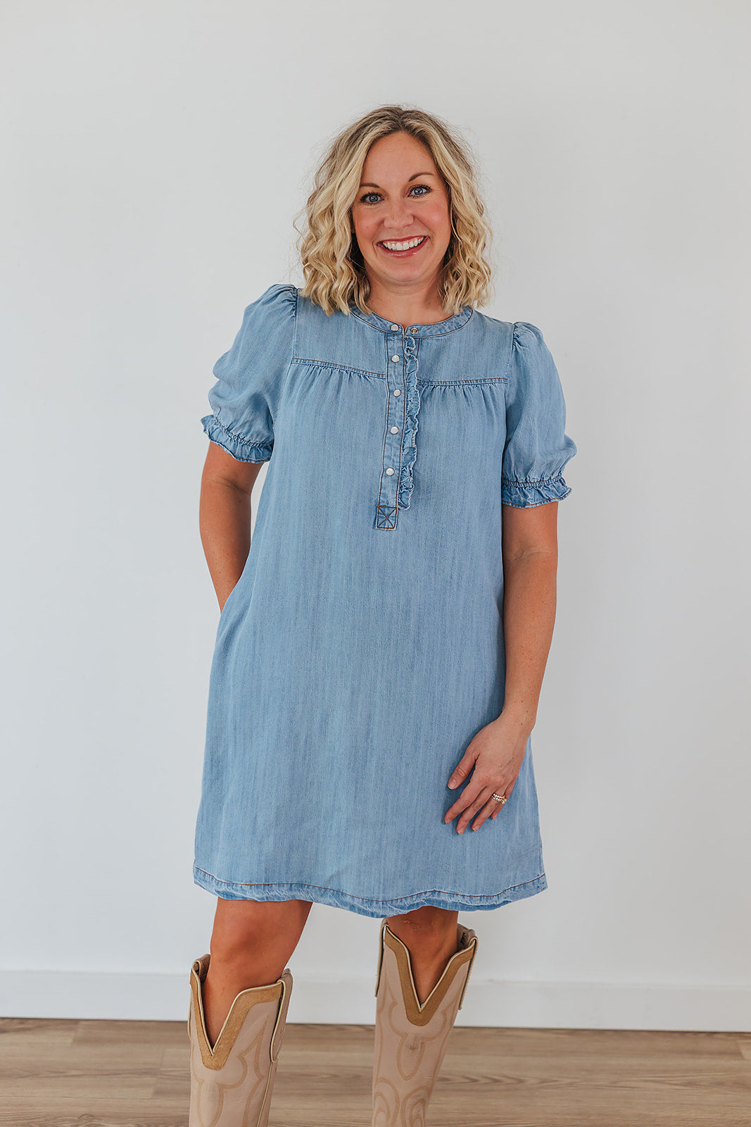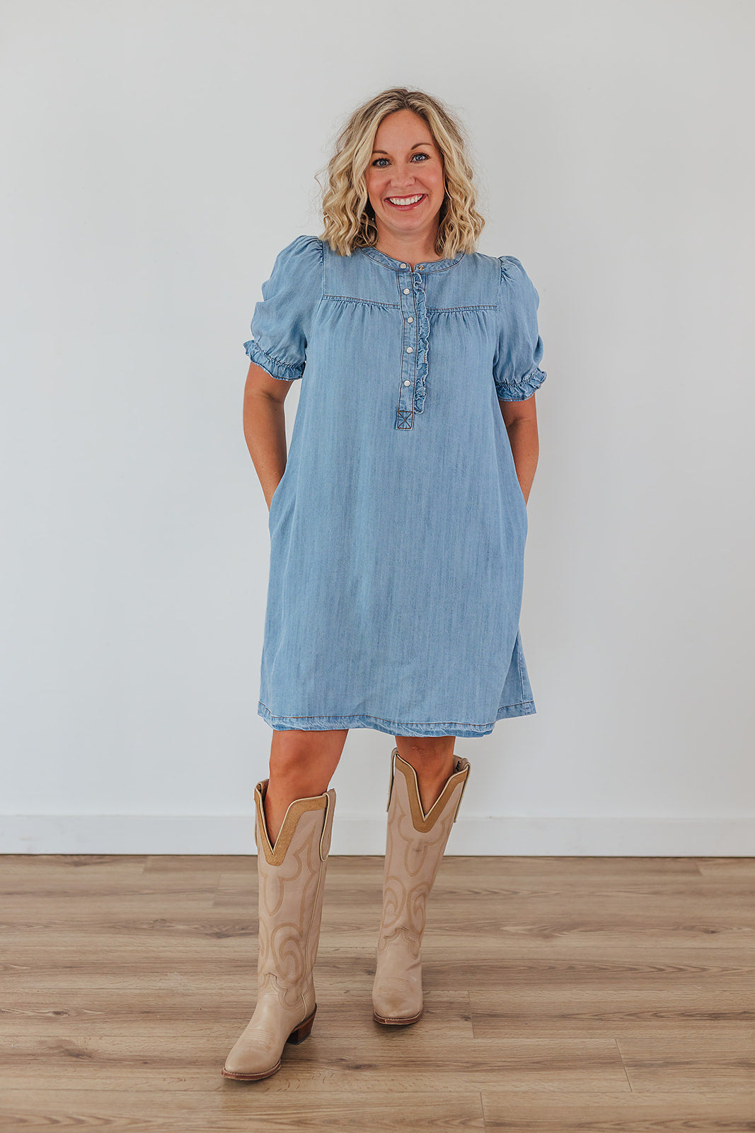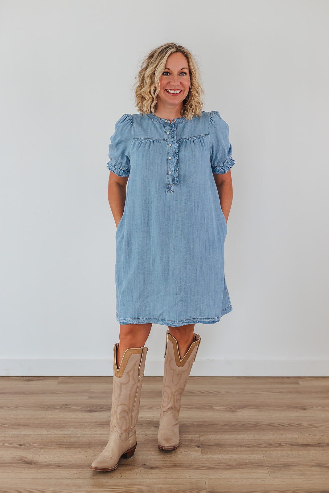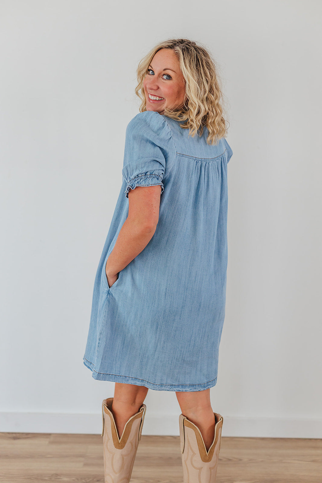 The Living Free Denim Dress is so dang cute with it's button front! It is just like our Connie Chambray Top and Campbell Chambray Top and we obviously just can't get enough! This dress has short, bubble sleeves with a button placket, round neckline, small metal buttons and side pockets.