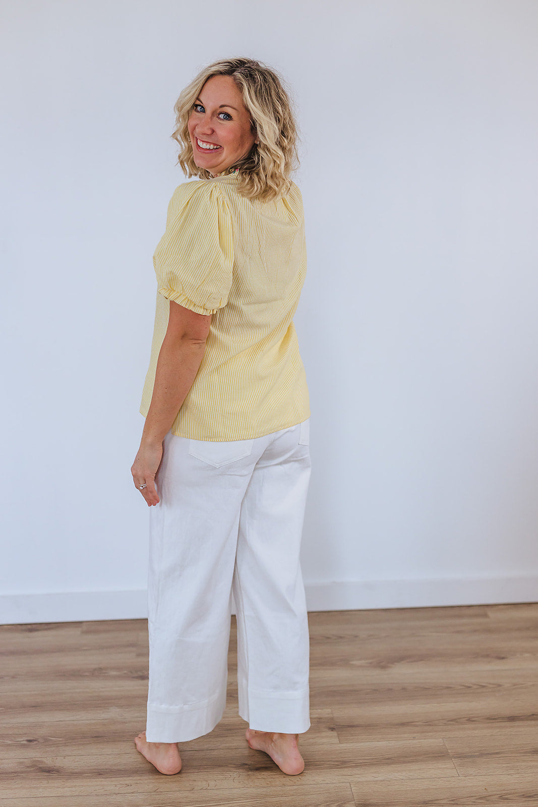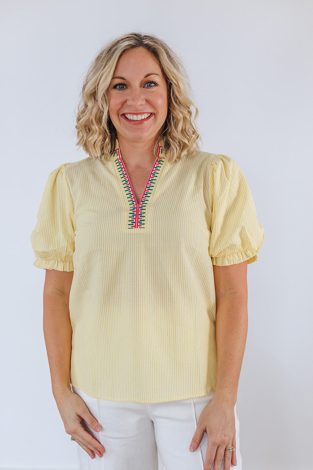 The Neon Rainbow Top is so pretty with its stitching around the v-neck line. It has small puff sleeves and slits on the sides. It pairs perfectly with white but will also pair great with denim or other colored pants. The perfect spring color!