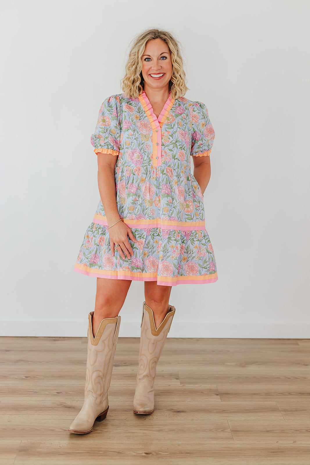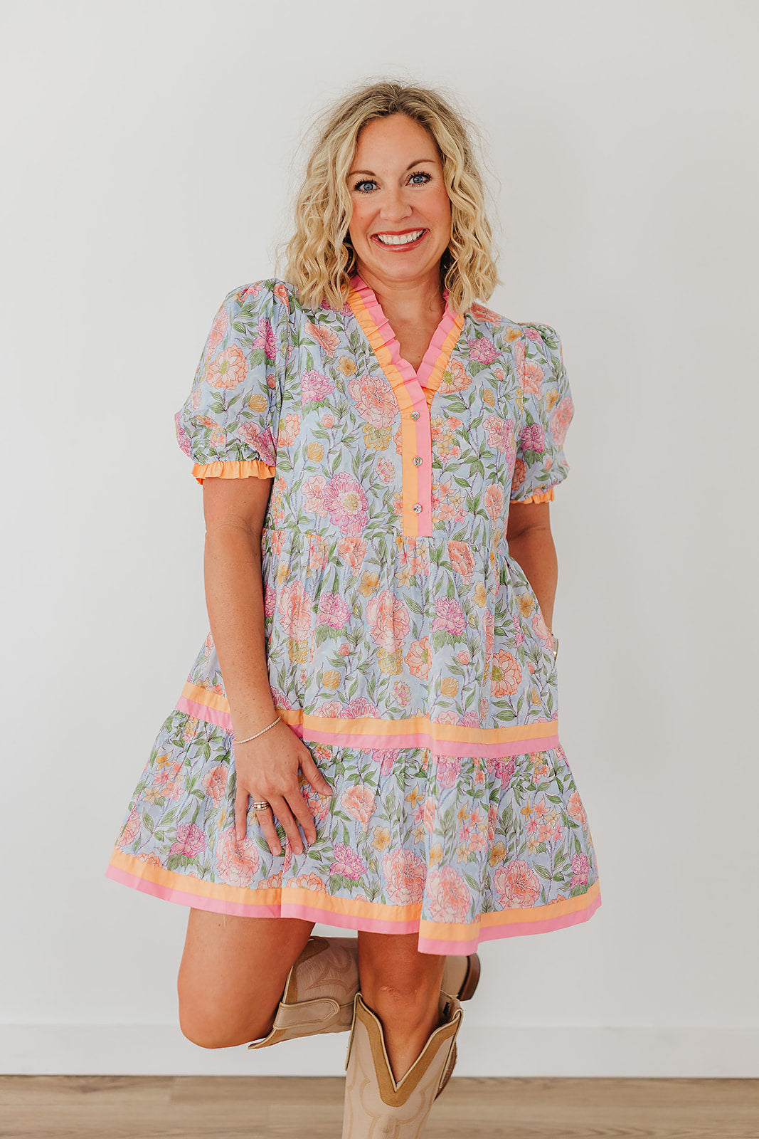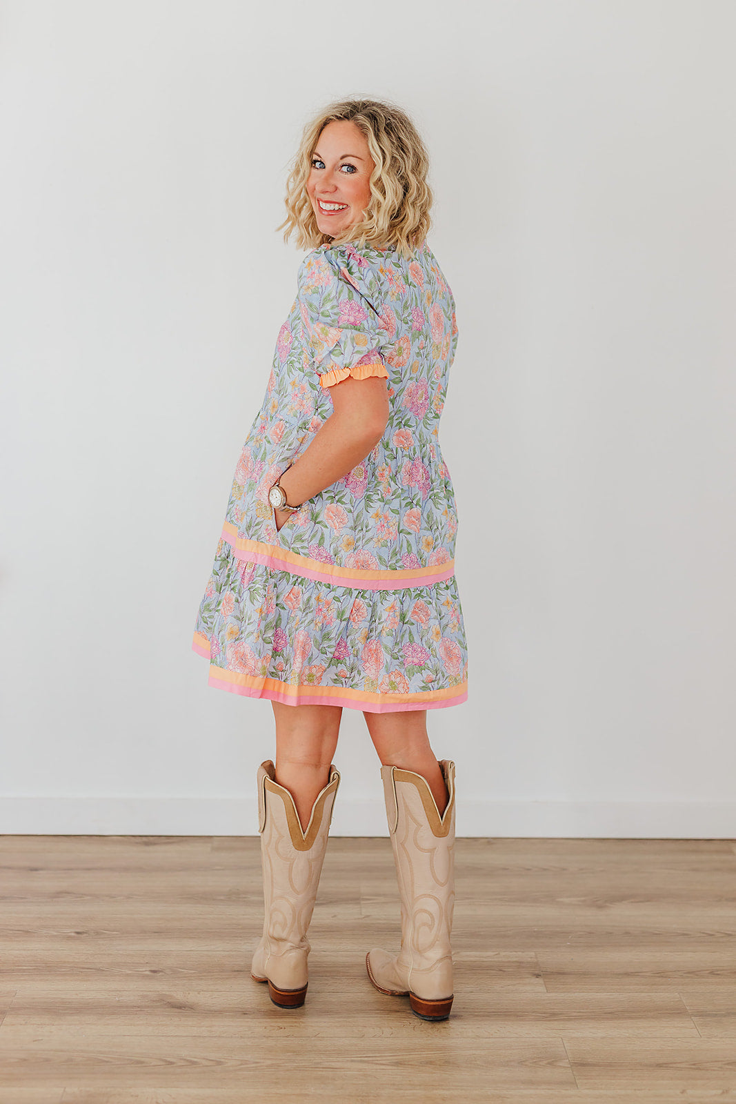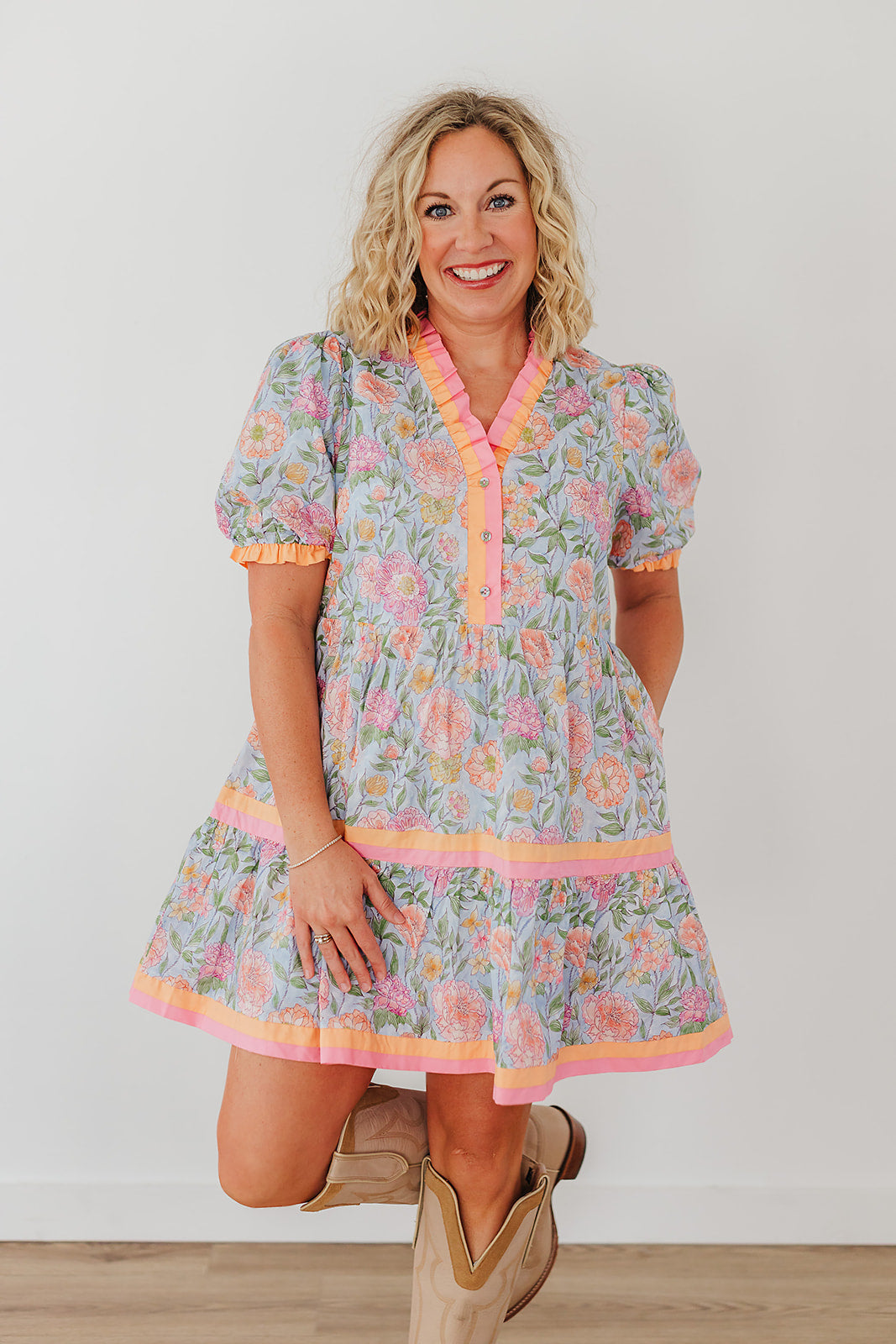 The Spring Into Action Dress in Sky Blue is by far one of my favorite pieces EVER. It has short, puff sleeves, a tiered floral babydoll style dress with solid contrast, front button up, ruffled neckline & sleeve detail, side pockets.
