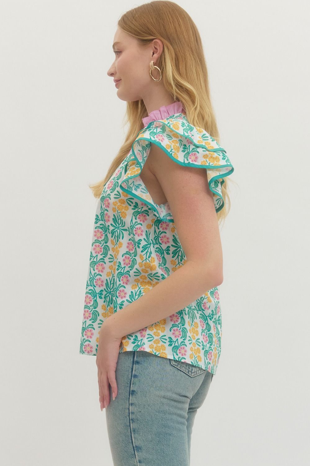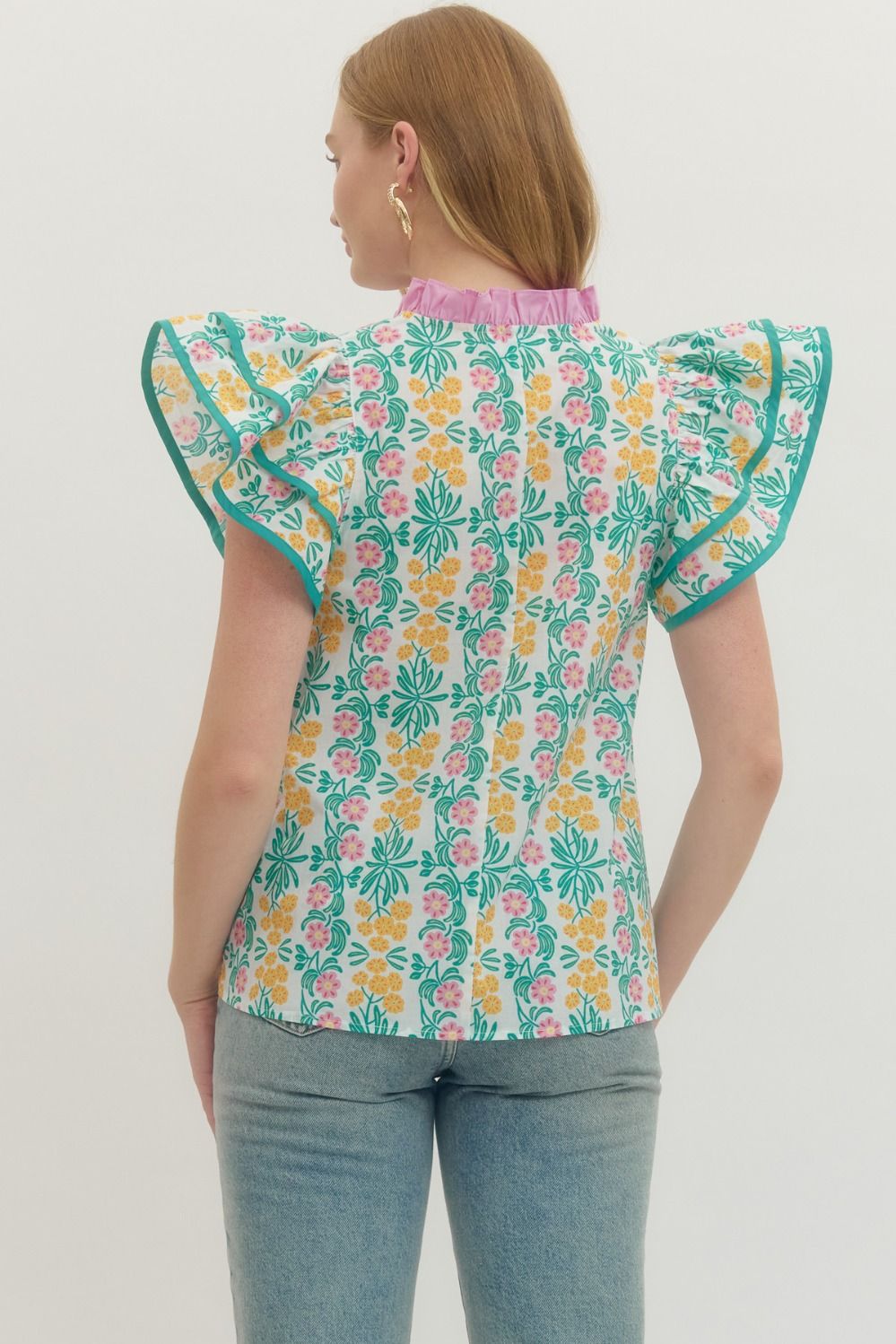 Floral print flutter sleeve top featuring contrast trim at neckline and sleeve edge. Unlined. Woven. Non-sheer. Lightweight