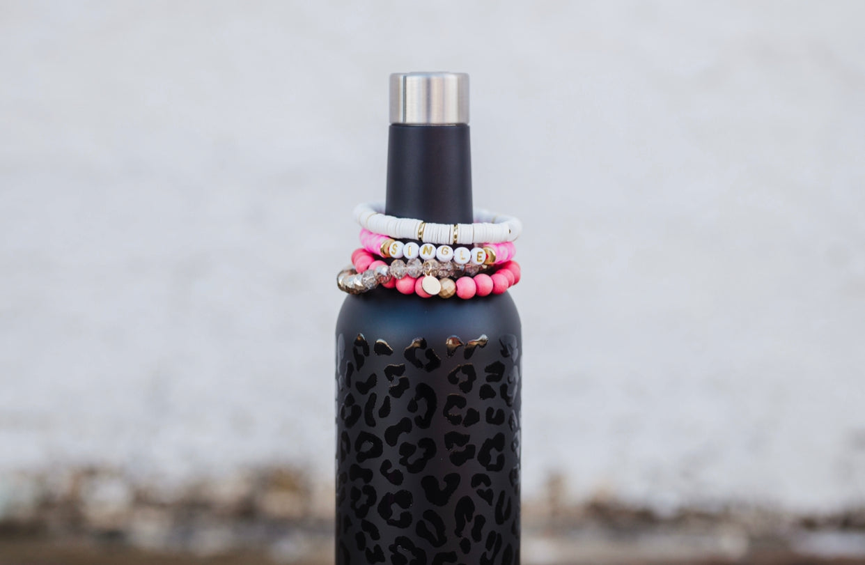 8mm Heishi Vinyl Disc stretchy bracelet with the word "Single" in gold and white 7mm block beads. Great to wear as a single or stacked set!