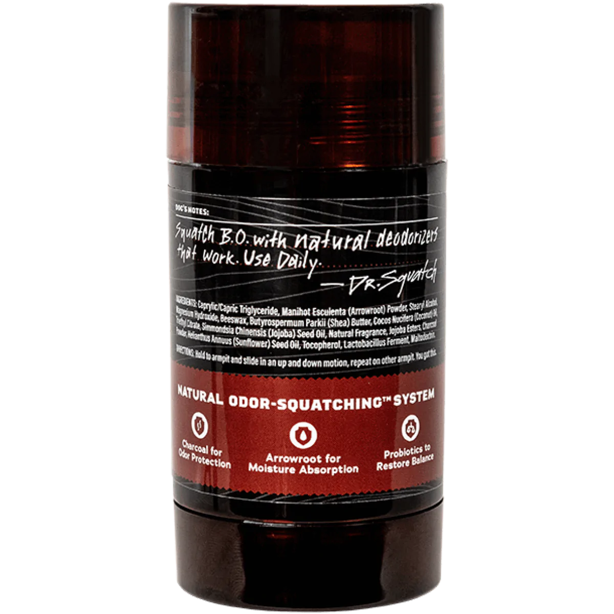Island Glory, Year Round. Dr. Squatch natural men’s deodorant keeps you fresh so that you can go about your day with confidence, no matter where it takes you. Our Odor-Squatching® system fights potential sources of B.O from every angle with powerful natural deodorizers such as charcoal powder to block odor, probiotics help to prevent the growth of odor-causing bacteria, and arrowroot powder to absorb moisture. With a smooth glide application and skin-nourishing moisturizers like jojoba and shea butter, our deodorant is gentle on your skin and leaves you—and your pits—ready for any adventure.