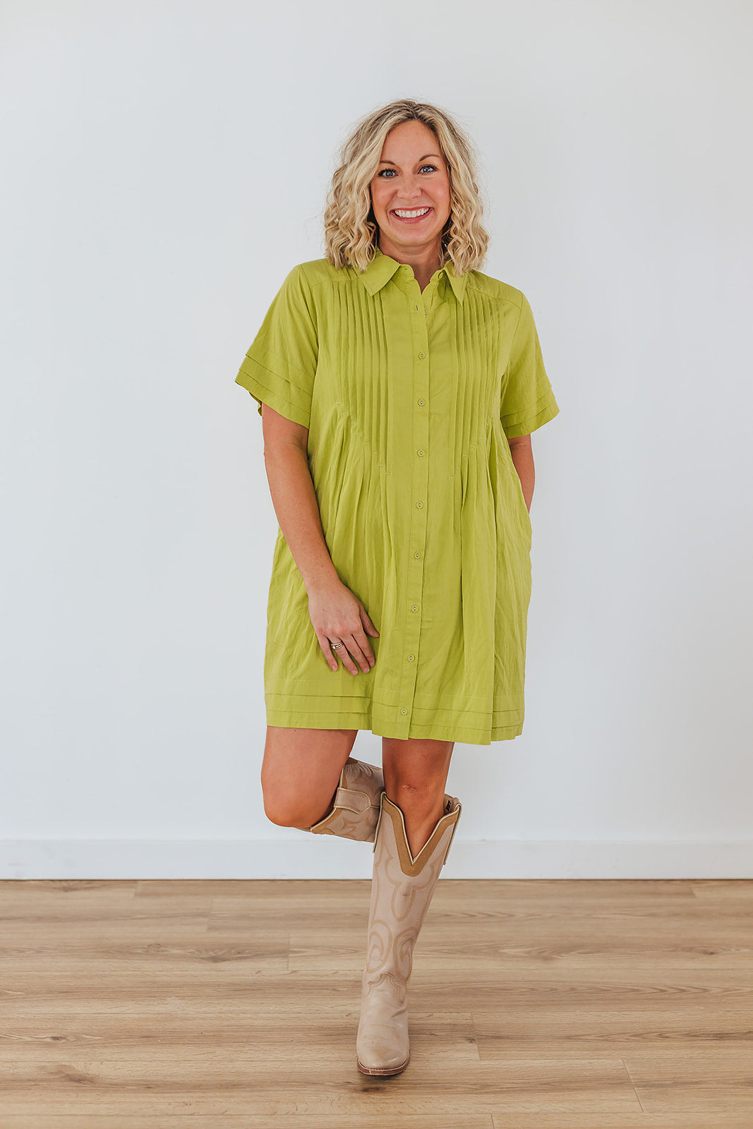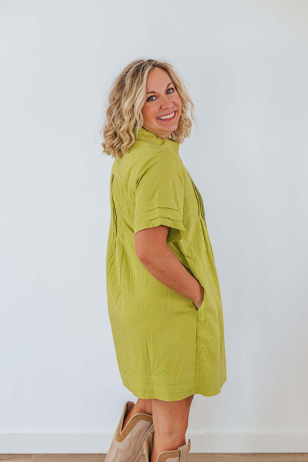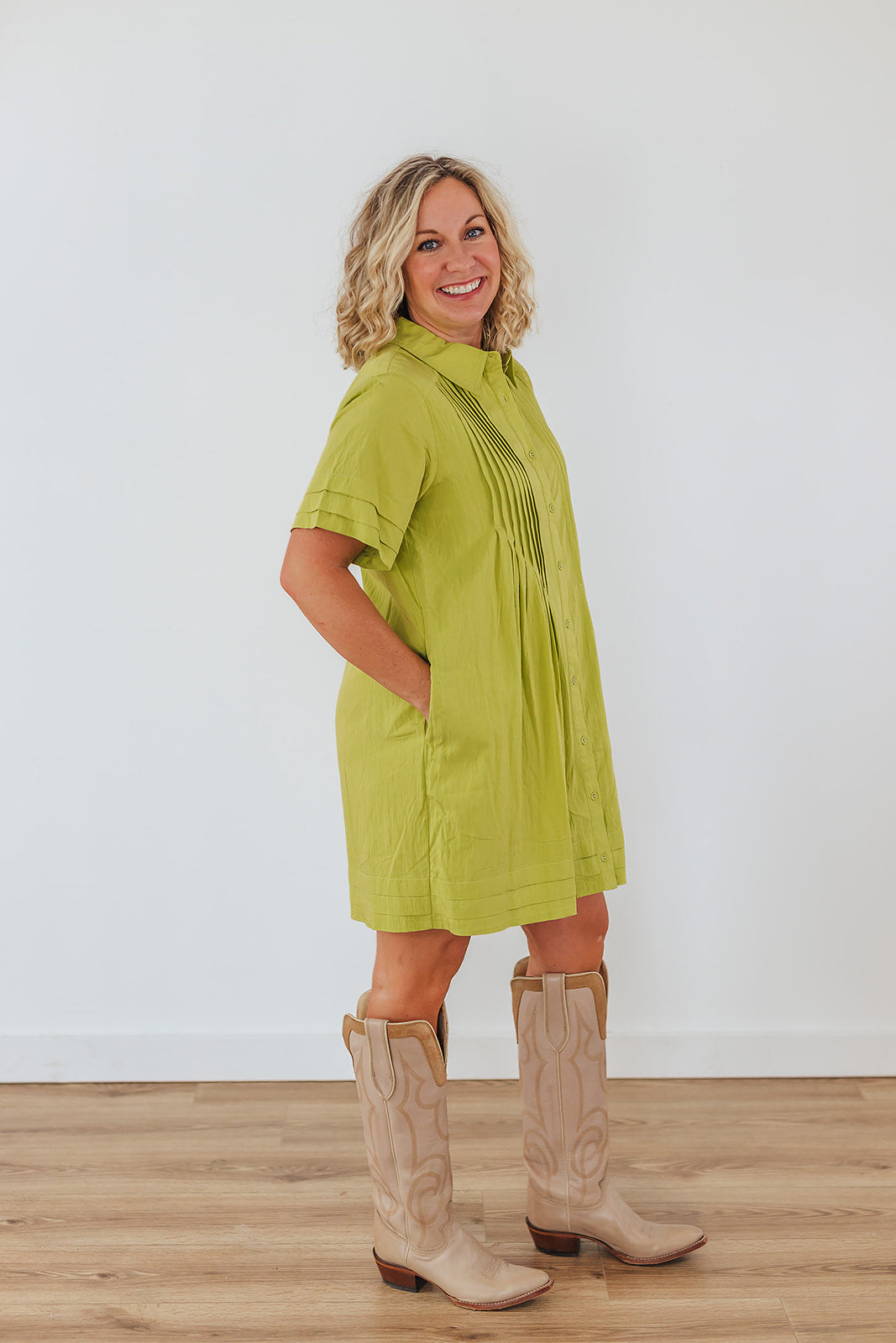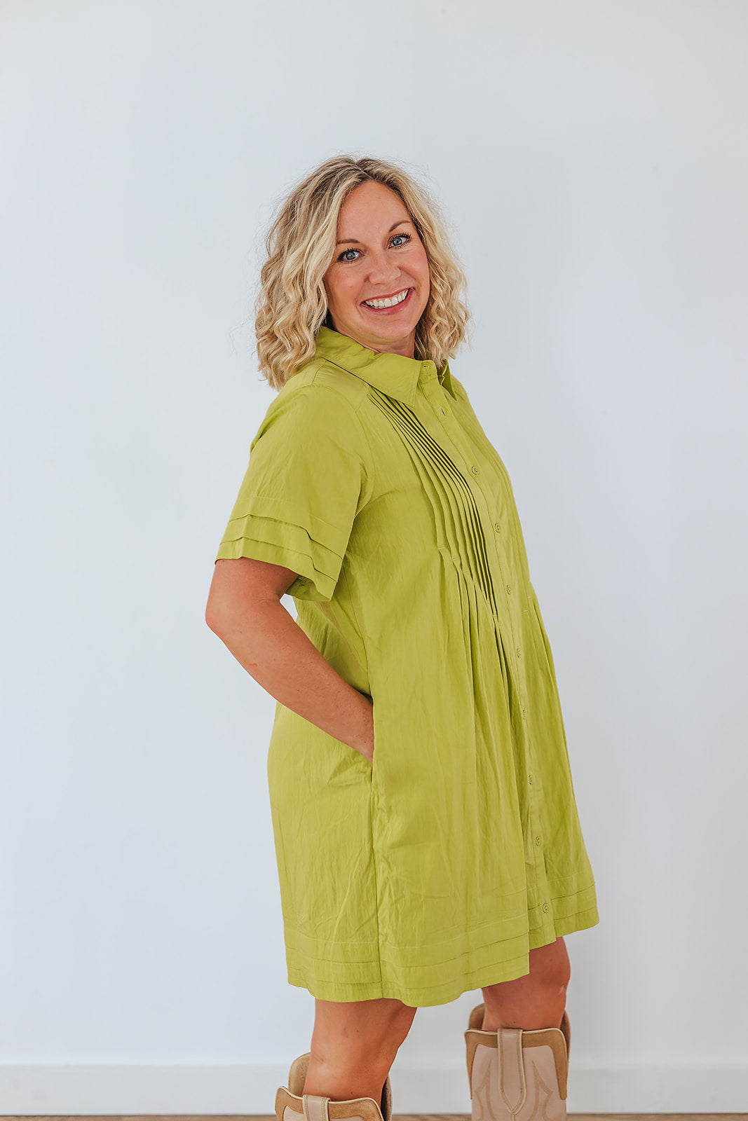 The Flatter Me Dress honestly surprised me! It made me feel so pretty and the color is just so cool! Truly a favorite of mine! It landed on my personal IG's top 5 favorites for this drop! This dress is a solid, short sleeve, mini shirt dress featuring pintuck detail at front and back, button closure at front, and side pockets. She is lined, woven, non-sheer and lightweight!