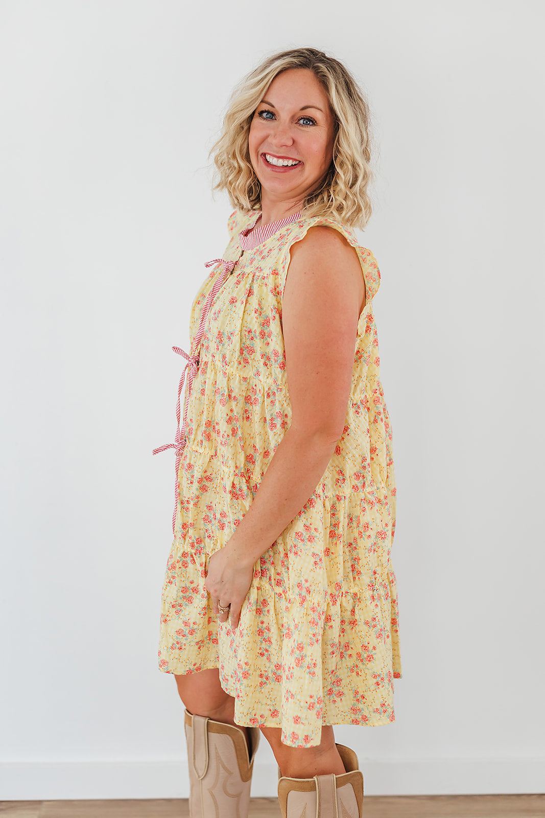The Lemme Lemonade Dress is seriously so cute and so fun! It is a seersucker dress with a bow front. This dress has a pretty floral print with a lightweight crinkle fabric, ruffled cap sleeves, tiered design.