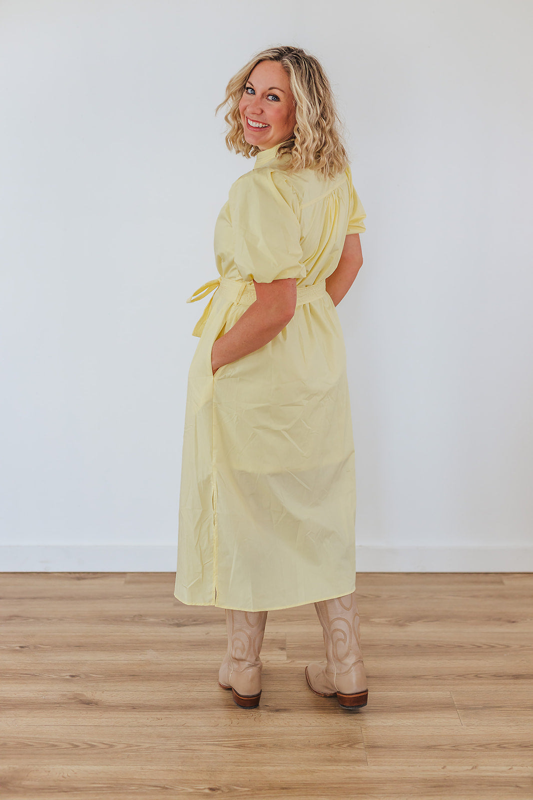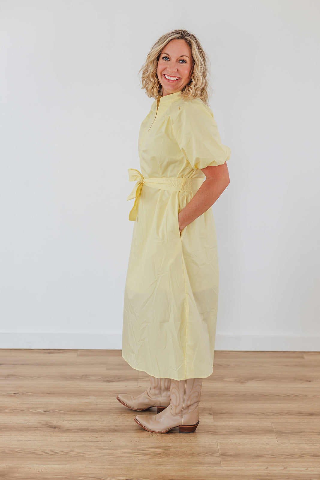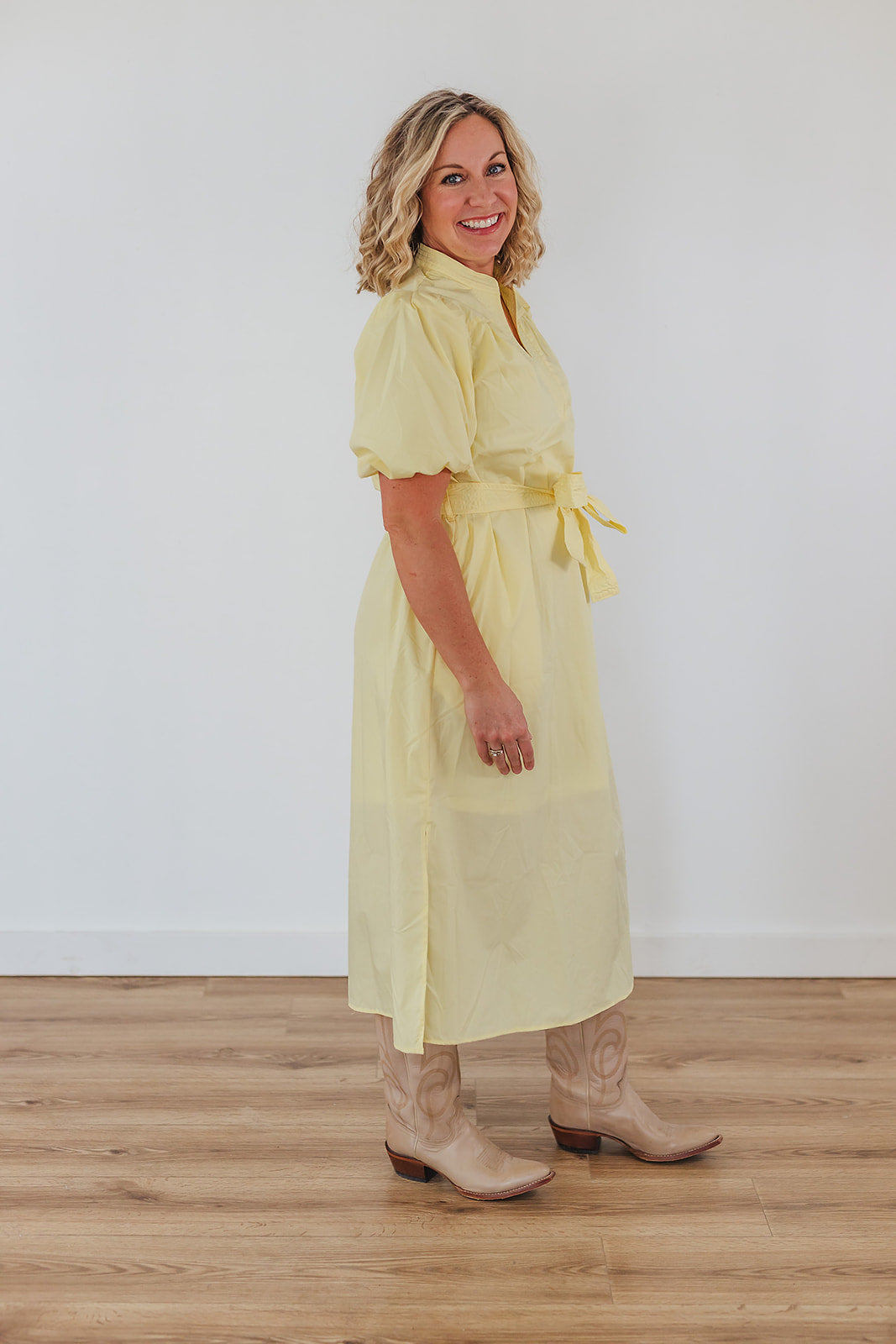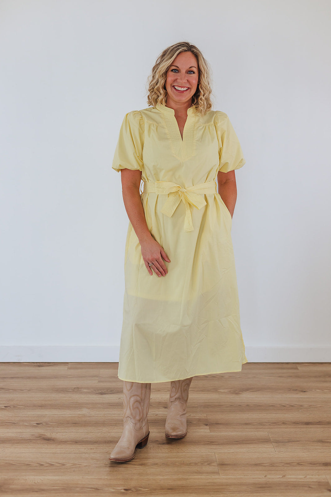 It's like the coziness of the warmth of sunshine after a season of cold weather. It just brings so much joy. The Sun Joy Dress is a beautiful yellow midi dress with wonderful puff sleeves, a v-neck with stitching, a tie waist and slits at the sides. This dress is lined to the knee and non-sheer.