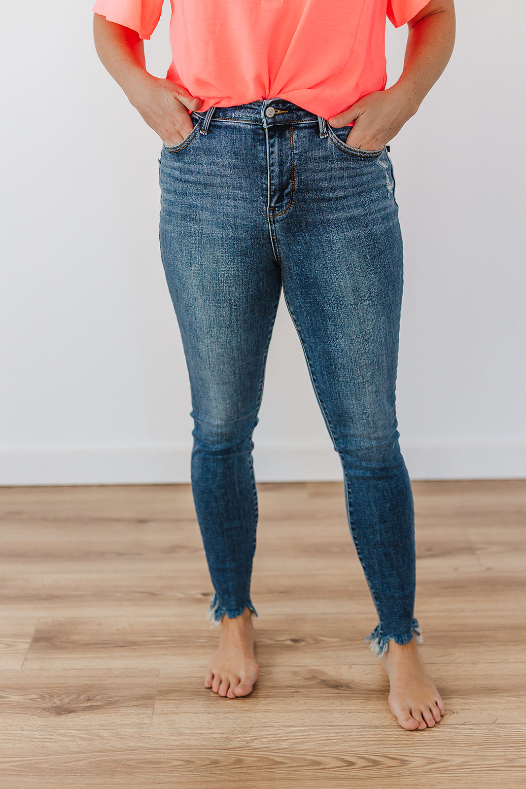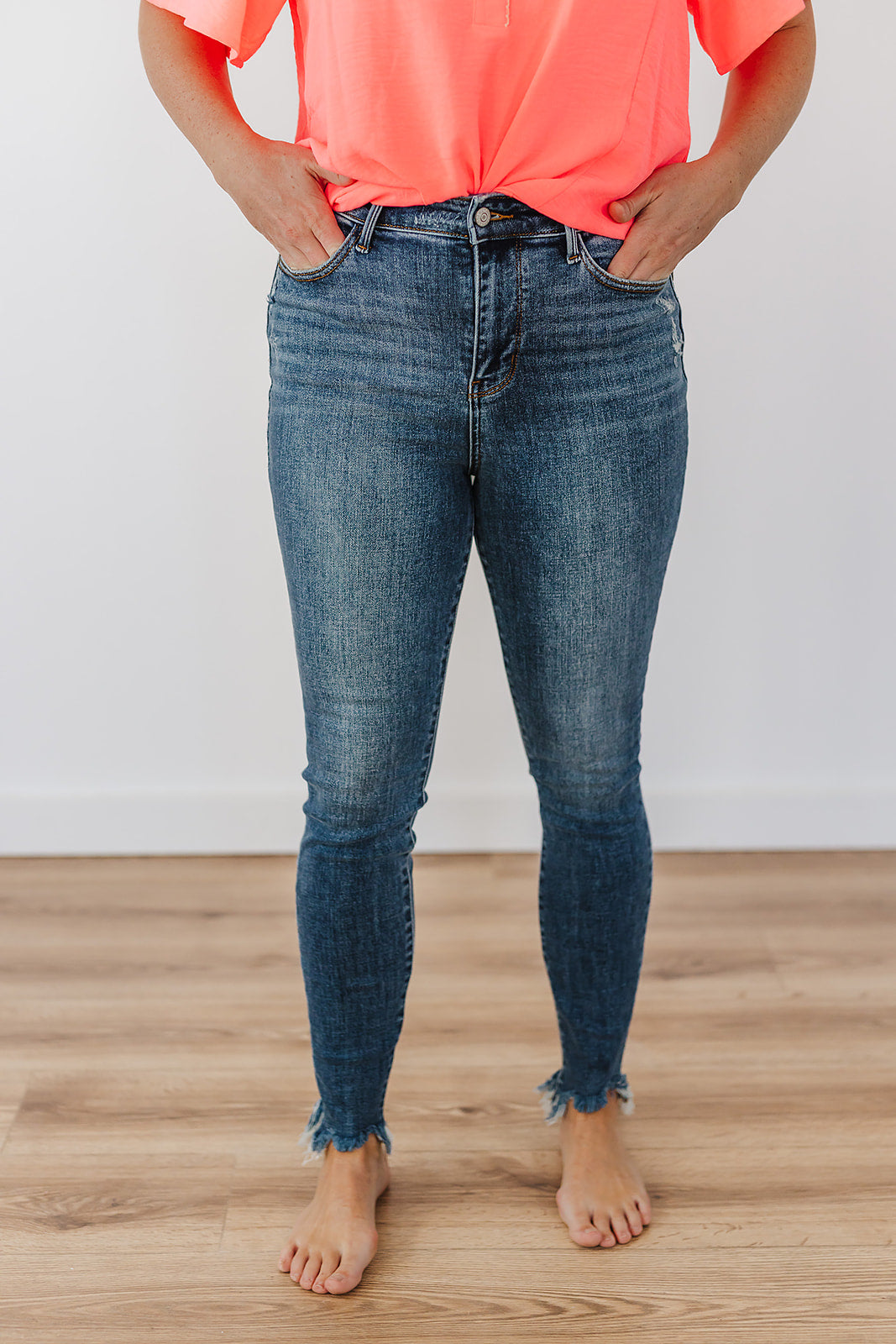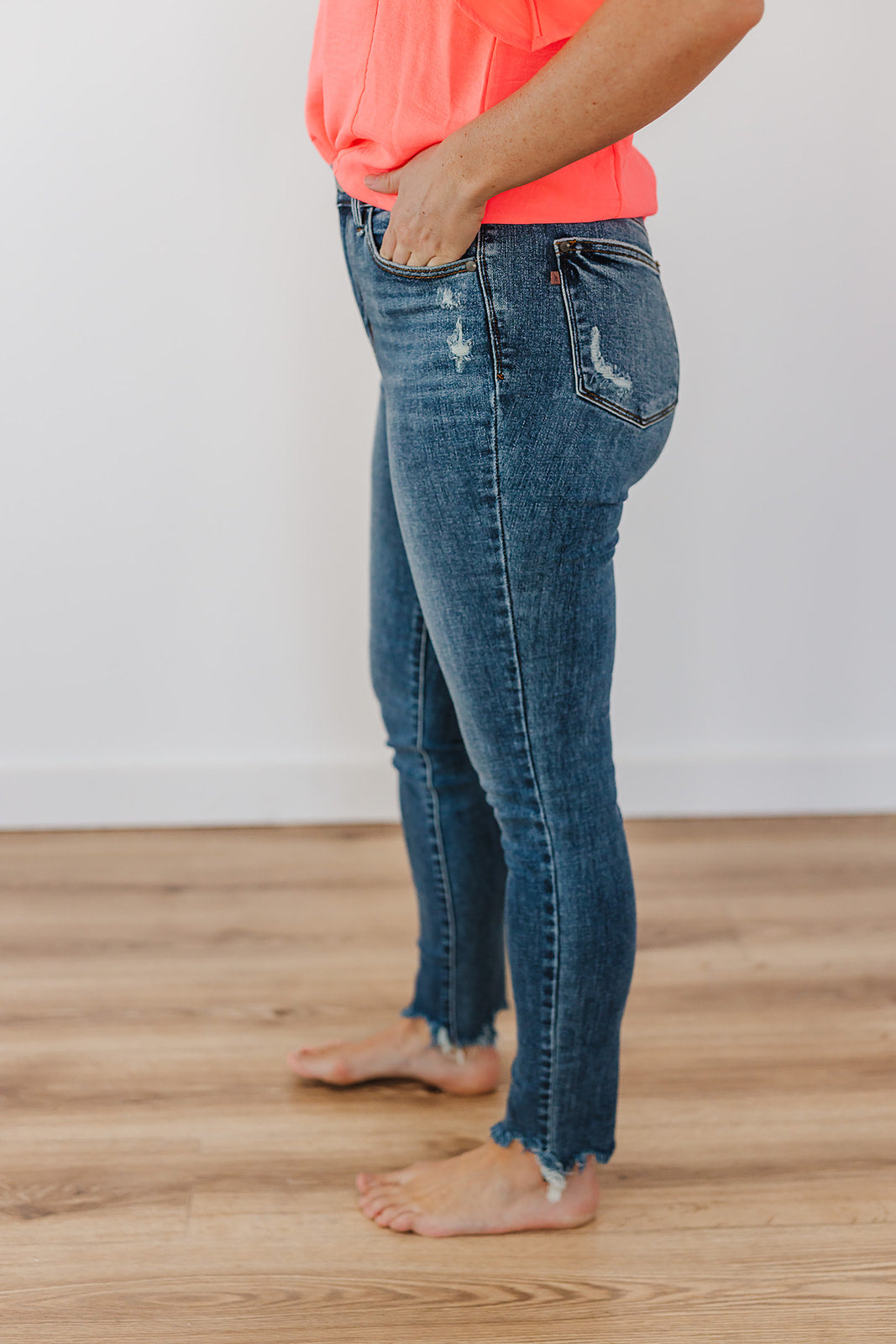 High Waist Skinny w/destroy & Shark Bit hem Medium Wash