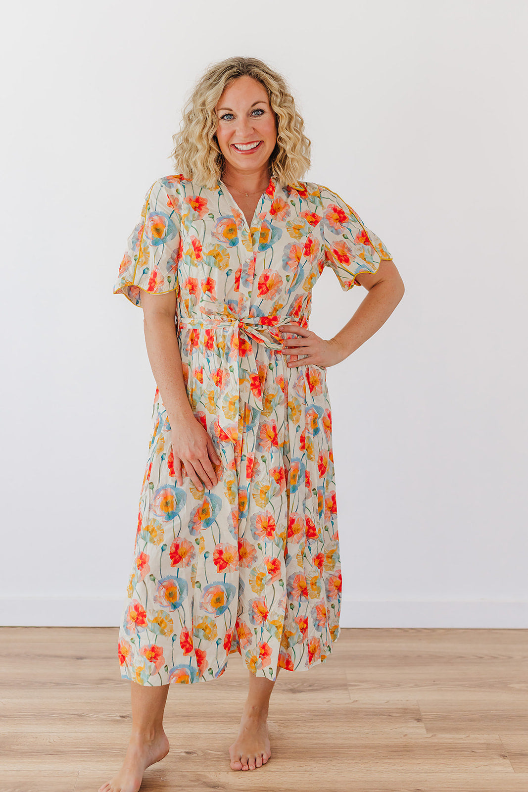 Button-down floral midi dress with tie waist