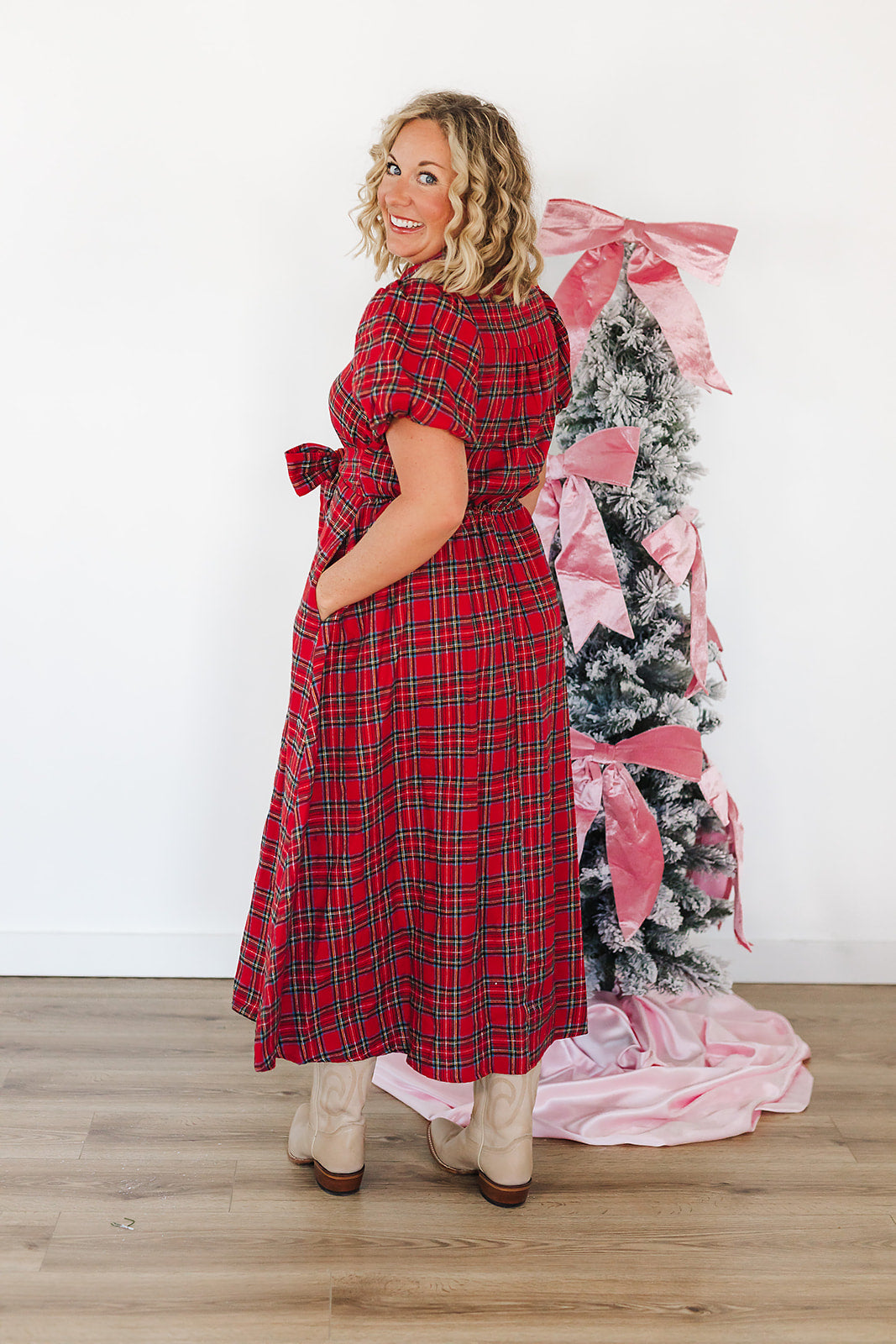 Plaid puff sleeve midi dress featuring self-tie waist belt and button closure at front. Side pockets. Lined. Woven. Non-sheer. Medium weight.