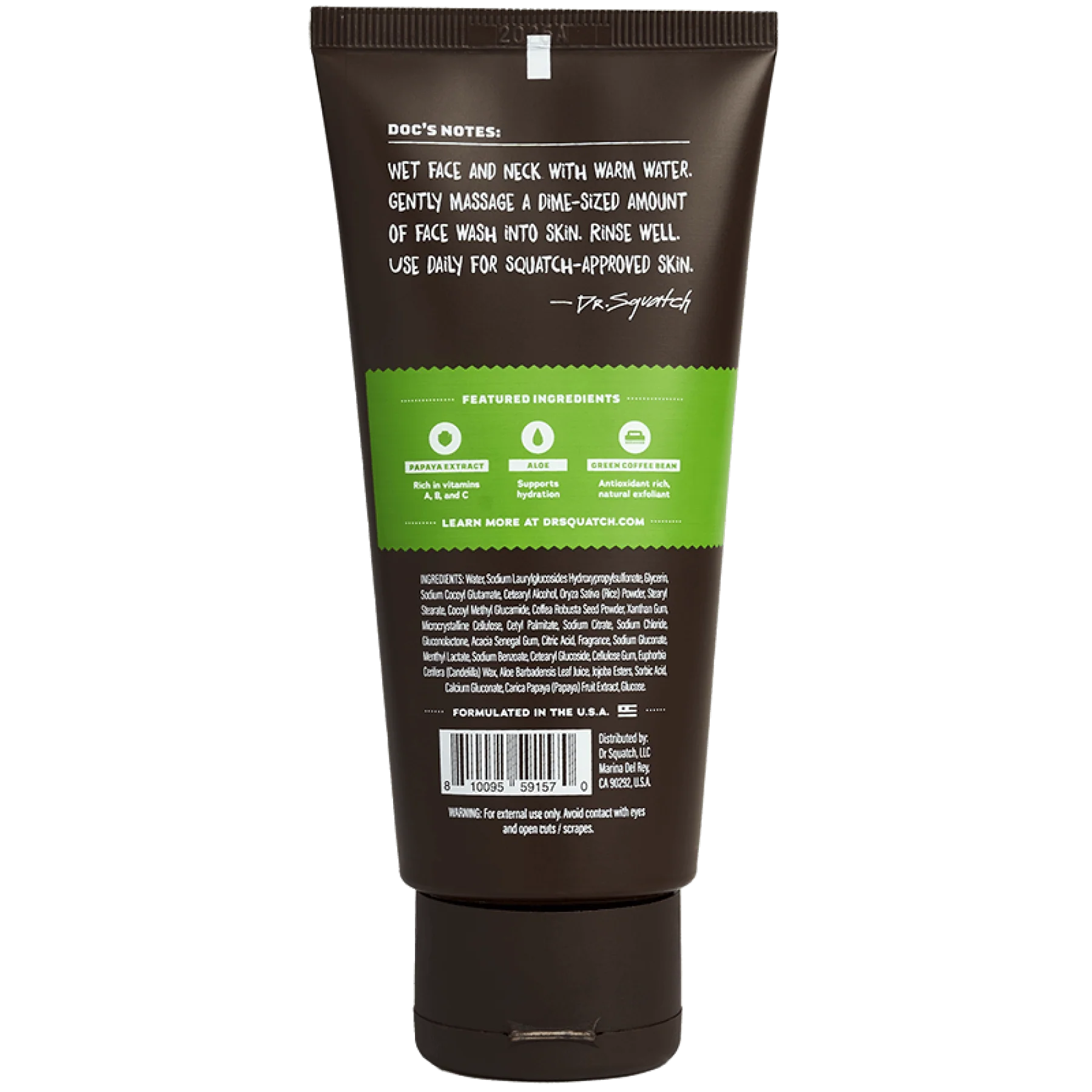 Designed specifically for men’s skin, our natural Face Wash is an instant routine upgrade that cleanses and gently exfoliates in one simple step. A combination of Green Coffee Bean, an antioxidant-rich exfoliant, hydrating Aloe Vera and vitamin-rich Papaya Extract will leave your skin cleansed and refreshed, while the revitalizing scent awakens your senses and energizes your day. Dermatologist-tested and free of sulfates, parabens, and phthalates, Dr. Squatch Face Wash is perfect for daily use on all skin types.
