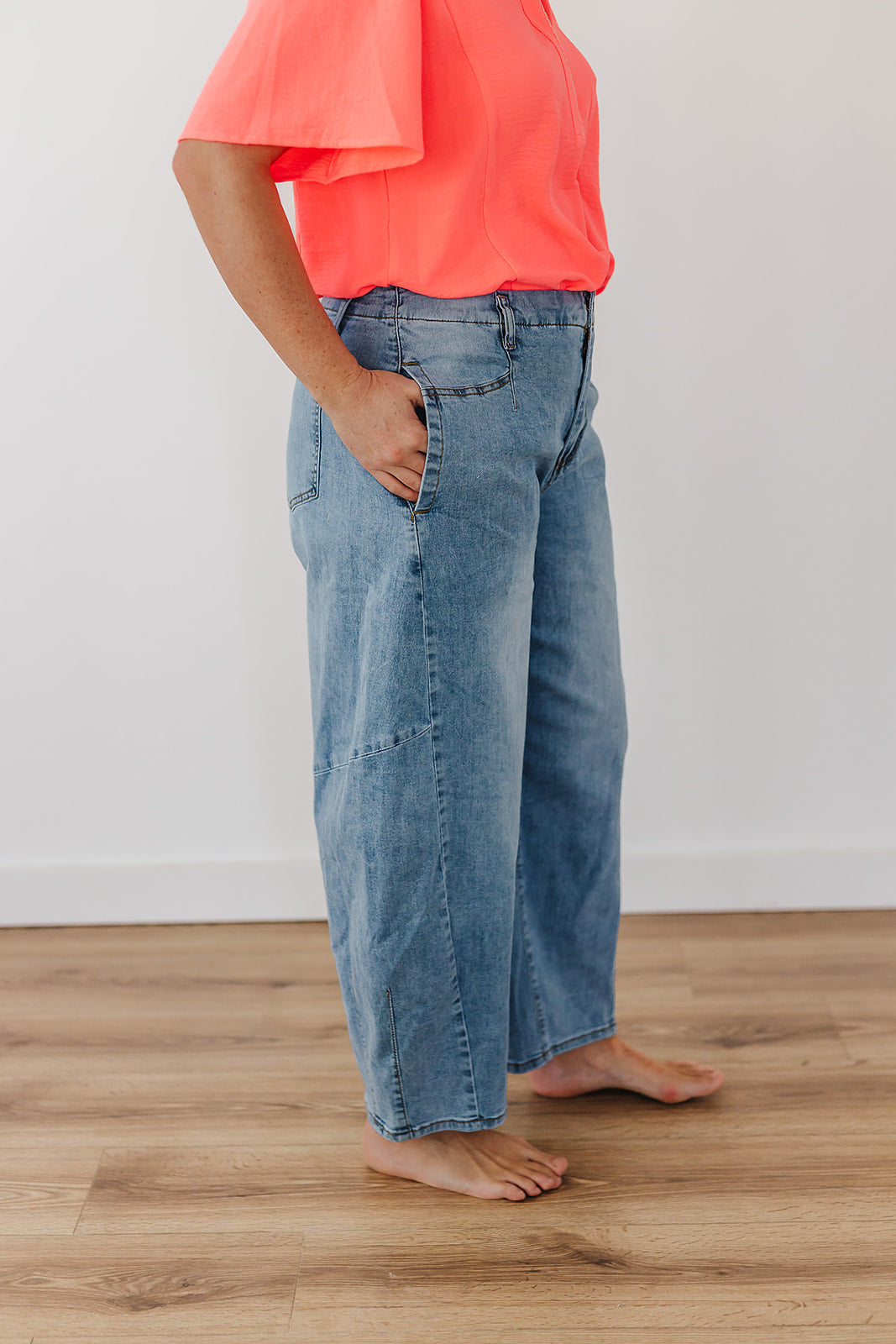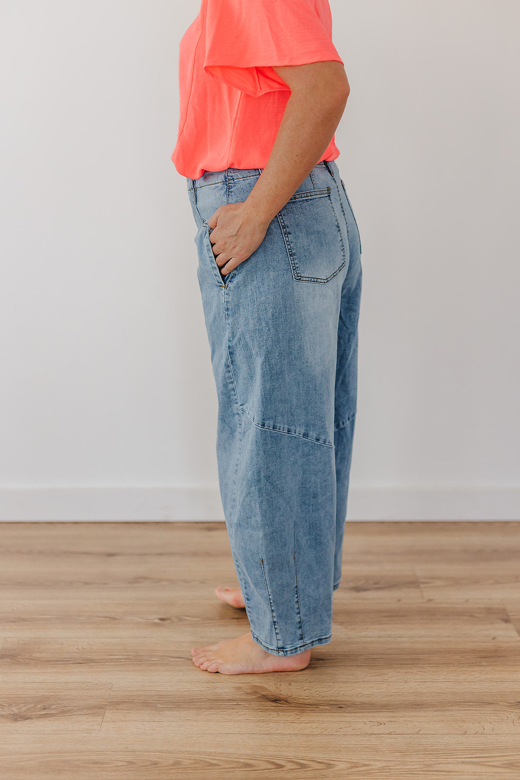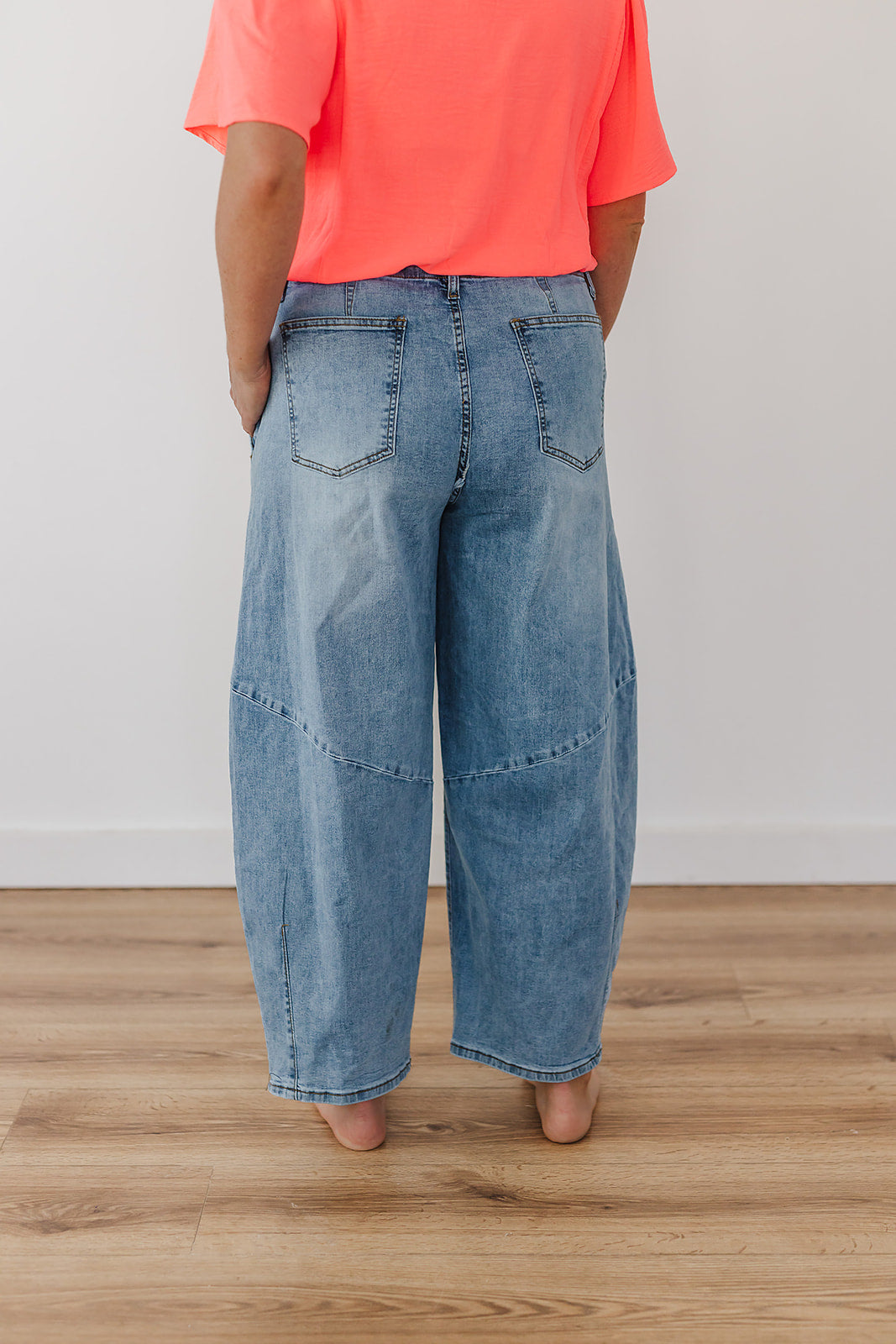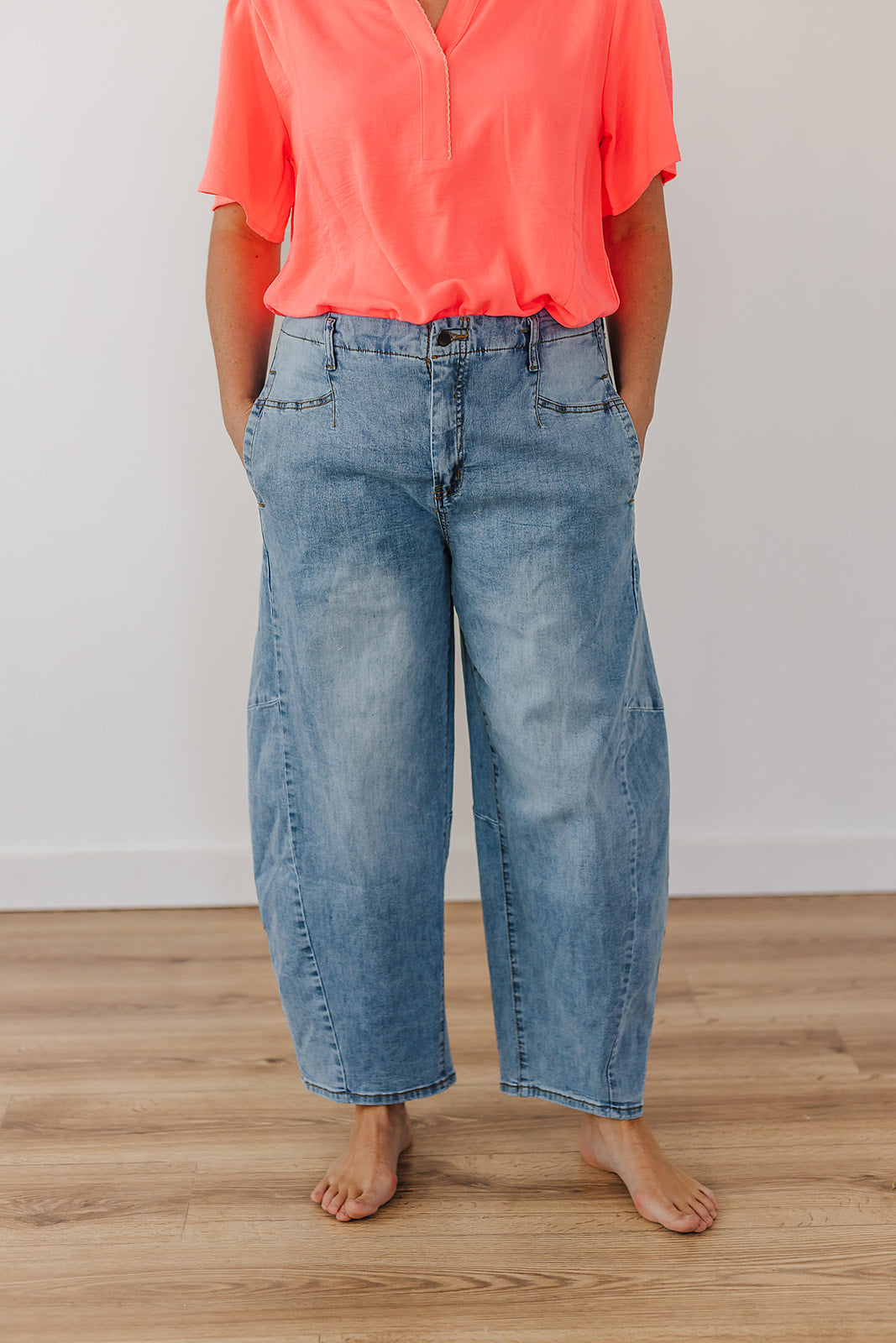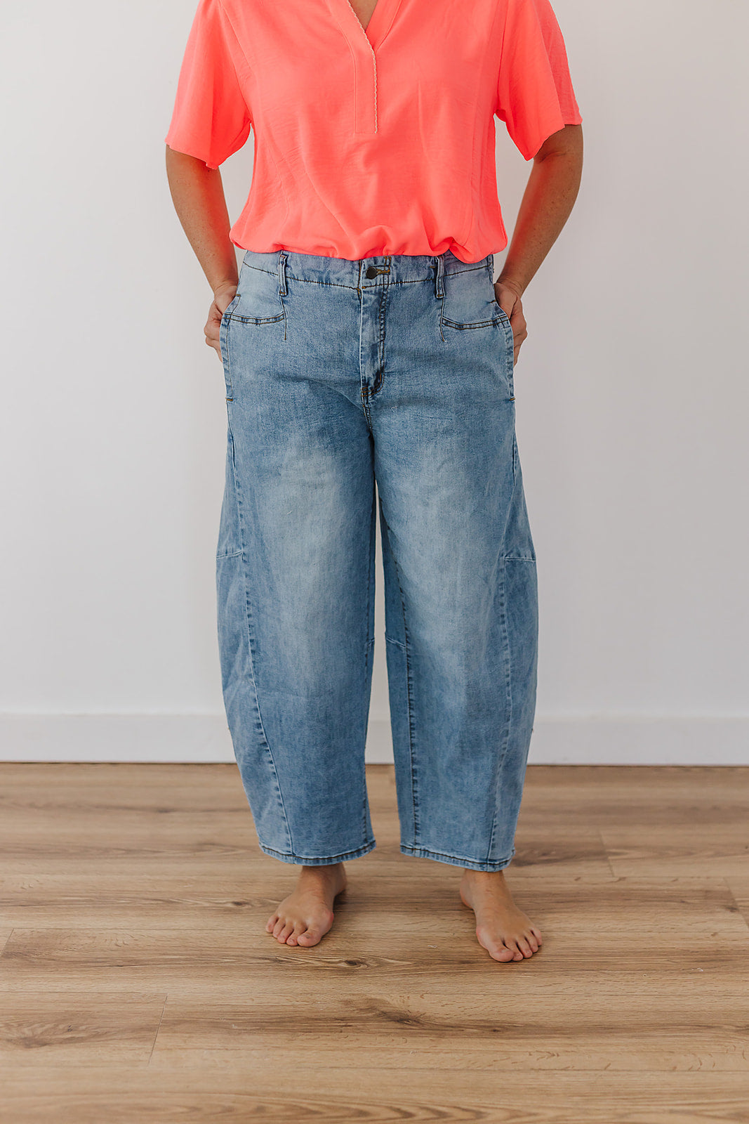 Give it up for the Washed Denim Barrel Jeans of the season!!!! clap, clap These jeans have real belt loops, baggy boyfriend jean silhouette, pockets on front & back with button and zip up front. The panel stitch detailing with a stretchy, relaxed and loose fit.