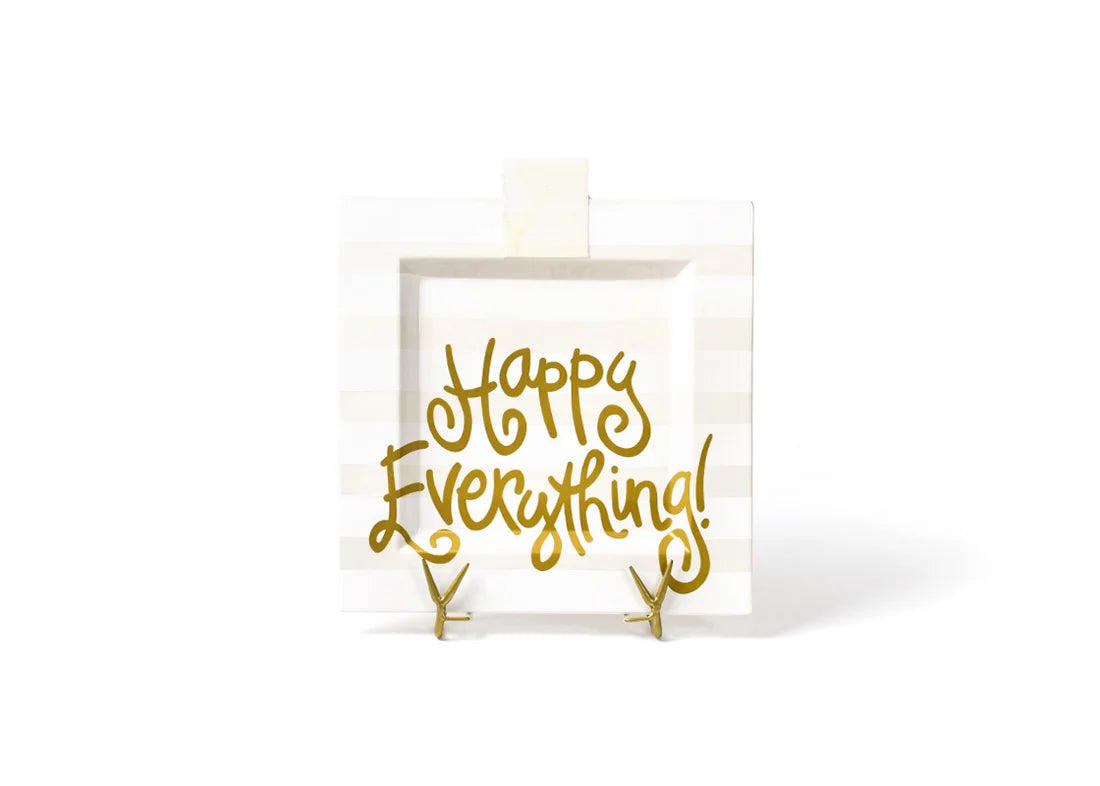 The fresh and airy white stripes accented with our signature Happy Everything! text adds cheer to tablescape. the Large square serving platter is supremely functional and stylishly happy. Serve happy to all your loved ones next time you entertain with our big serving platter.